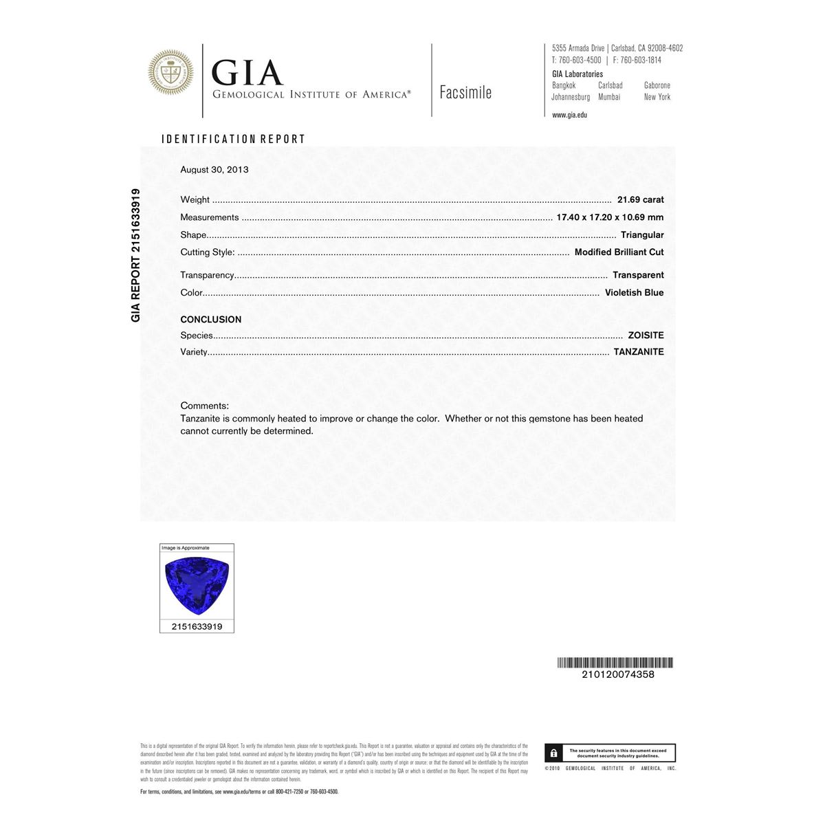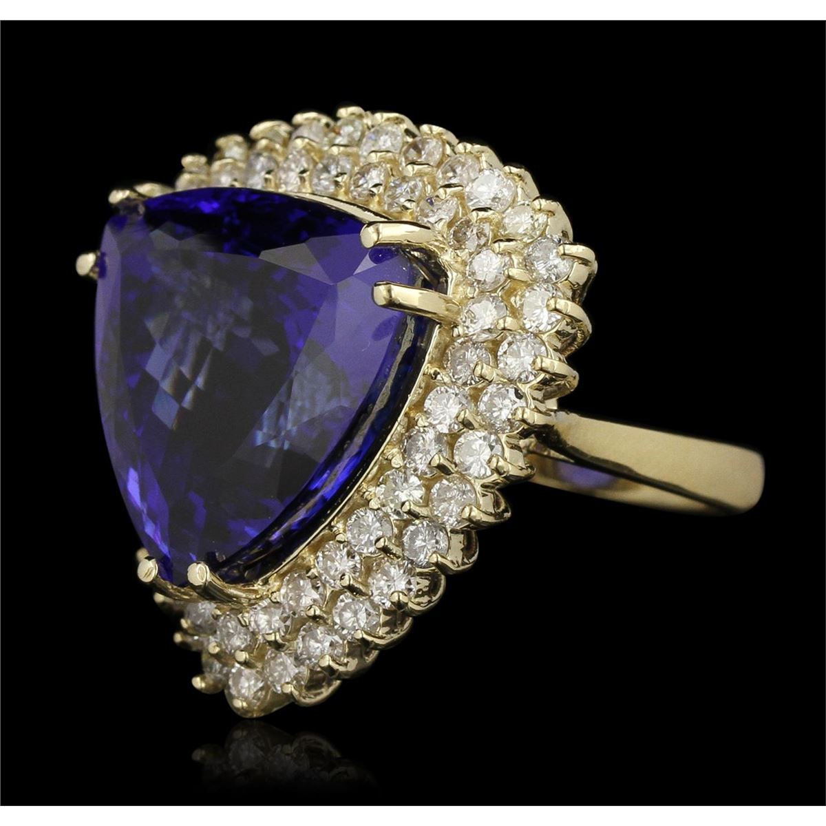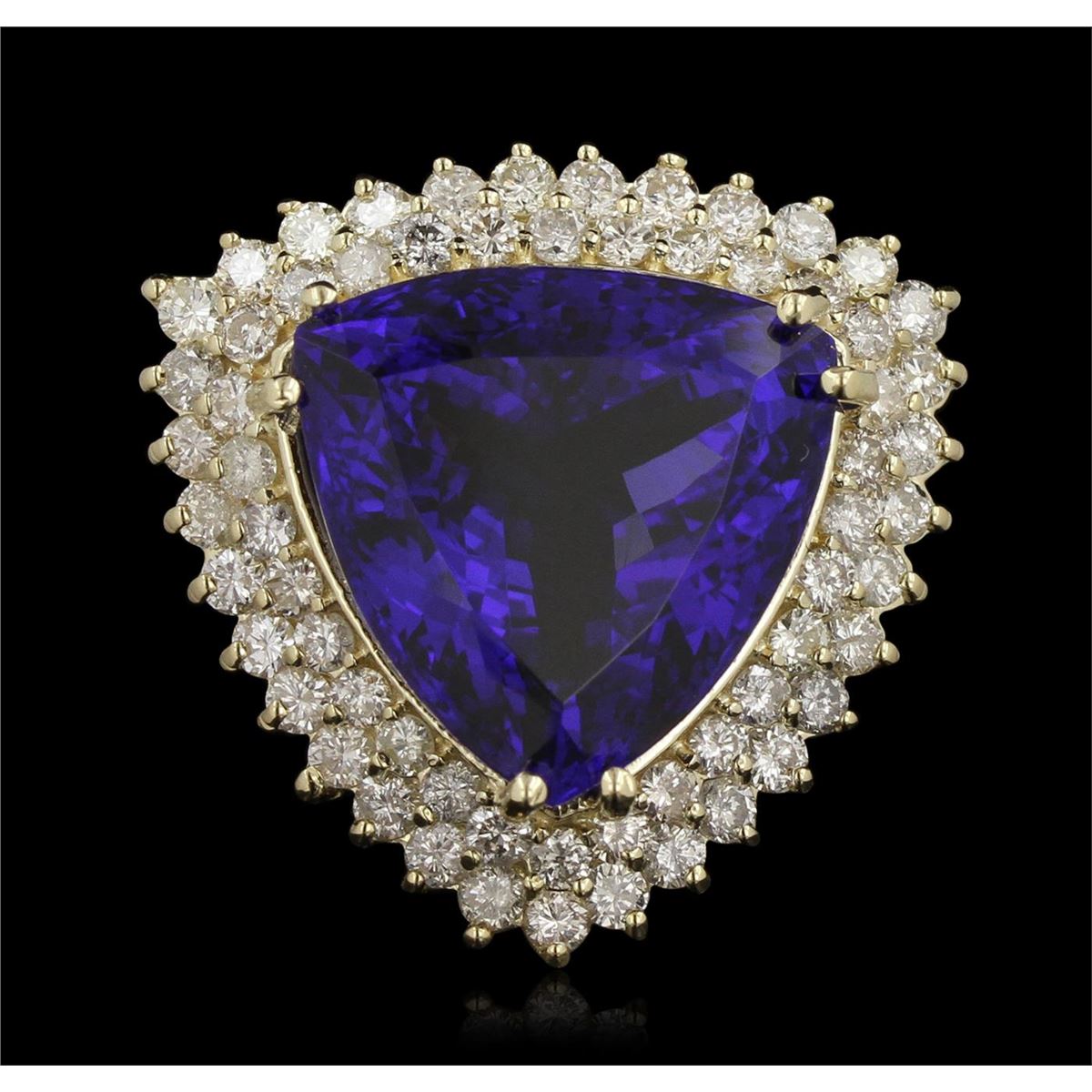 One electronically tested 14KT yellow gold ladies cast tanzanite and diamond ring with a bright polish finish. Condition is new, good workmanship. The featured tanzanite is set within a two tiered diamond lattice gallery, completed by a three millimeter wide band. Identified with markings of "K14". Containing: One prong set triangle modified brilliant cut natural tanzanite, measuring 17.40 x 17.20 x 10.69mm, 10% bulge factor, exact weight 21.69ct., clarity is eye clean, type I, medium dark, moderately strong, violetish blue color, (GIA vB 6/4), cut is good. Transmitting light with no distortion, transparent. GIA. Colored Stone Grading Report attached. Graded loose prior to setting in the GIA Laboratory, Report # 2151633919. Tanzanite is a very rare gemstone that is only found in the country of Tanzania. Originally discovered in 1967. Tiffany & Company, named the stone Tanzanite. It is found in the Usumburu Mountains that border the Umba Valley of northern Tanzania. Tanzanite occurs in gray, brown, violet, blue, reddish-purple, & green. The gem is interesting because of its exceptional pleochroism. Rotated in different directions a tanzanite will exhibit multiple changes of color. Tanzanite has a low tolerance to ultrasonic cleaning, and should not be cleaned using this method. Sixty-three prong set round brilliant cut diamonds, measuring 2.10 - 2.00 x 1.23mm (depth est.) approximate total weight of 63 Stones = 2.48ct. Faint secondary color throughout. Graded in the setting. Clarity I-1 to 1-2. Color K - M. Total Weight of Colored Stones 21.69ct. Total Weight of Diamonds 2.48ct. Total Weight of Ring 14.50gm. AIG Appraised at $66,920.00.