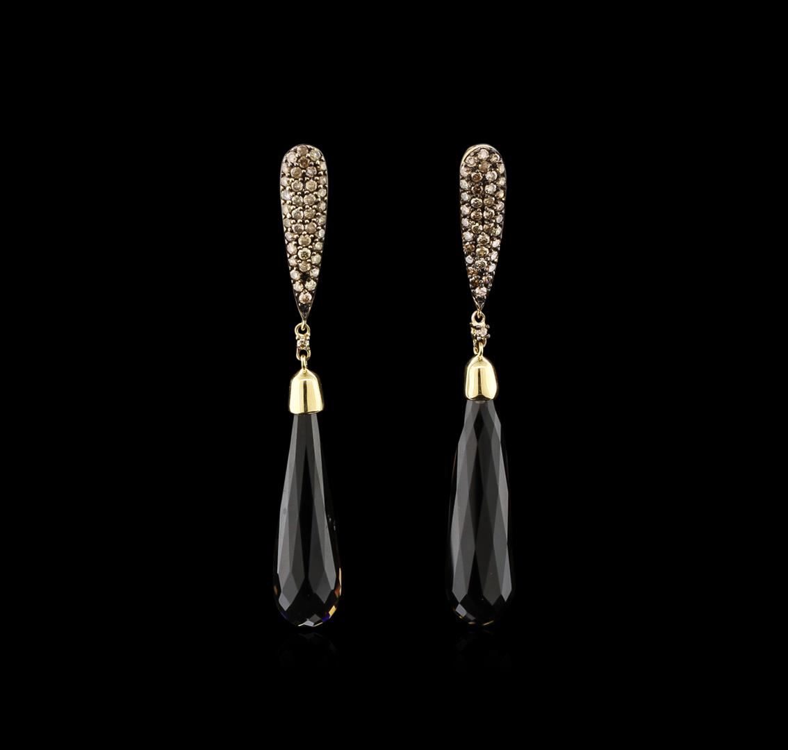 One pair of earrings featuring: 14KT yellow gold weighing 4.27 grams containing two smokey quartz with a total weight of 22.00ct and 76 brown diamonds with a total weight of 1.16ct.