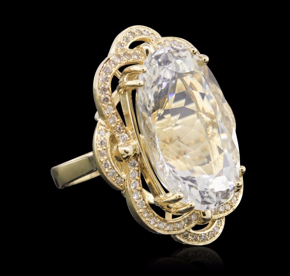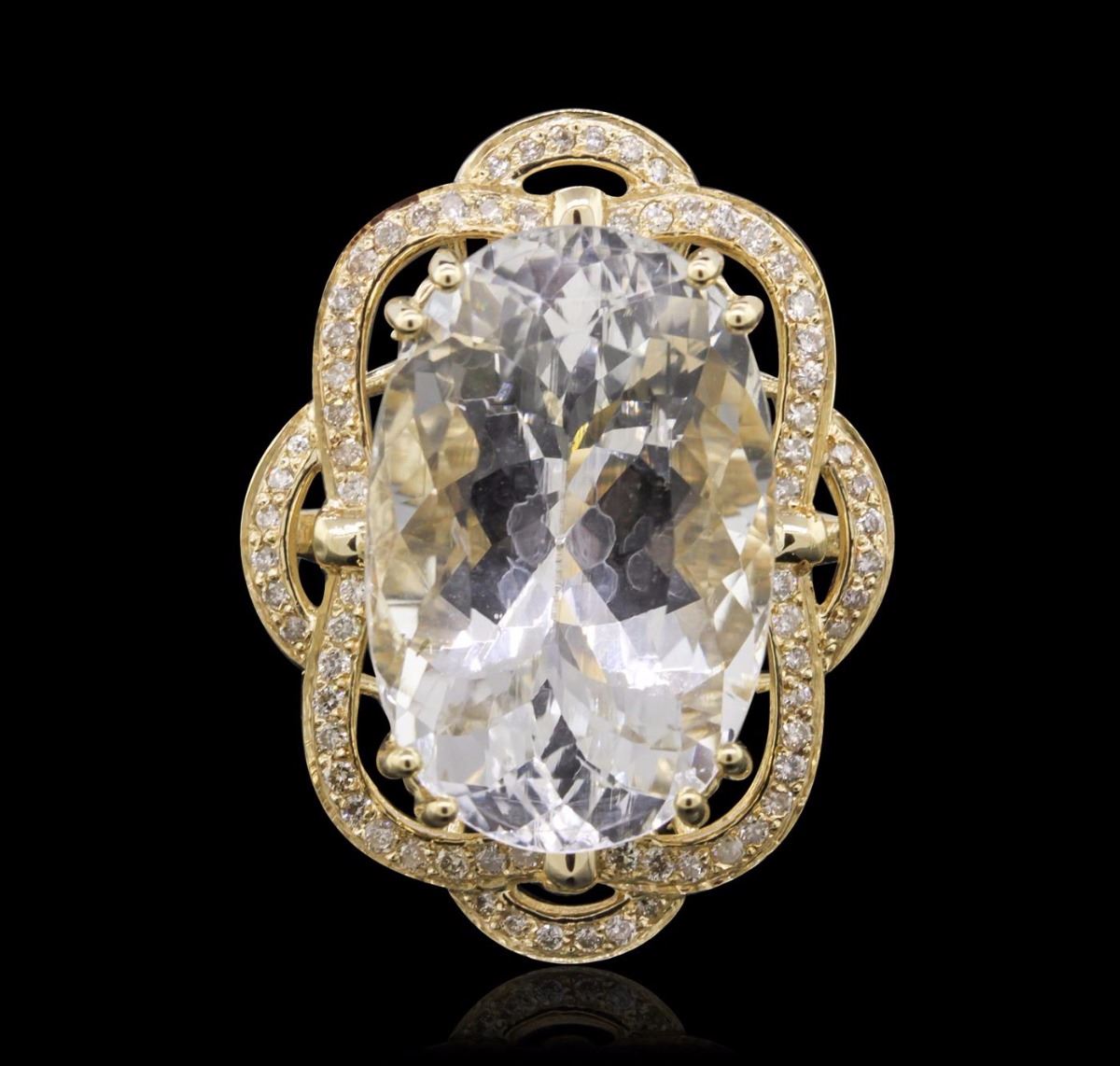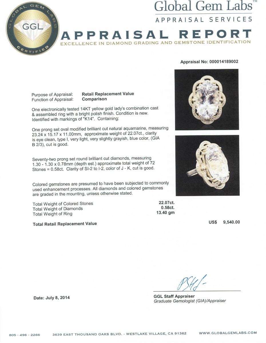 One electronically tested 14KT yellow gold Ladies combination cast & assembled ring with a bright polish finish. Condition is new. Identified with markings of "K14". Containing: One prong set oval modified brilliant cut natural aquamarine, measuring 23.24 x 15.17 x 11.00mm, approximate weight of 22.07ct., clarity is eye clean, type I, very light, very slightly grayish, blue color, (GIA B 2/3), cut is good. Seventy-Two prong set round brilliant cut diamonds, measuring 1.30 - 1.30 x 0.78mm (depth est.) approximate. Total Weight of 72 Stones = 0.58ct. Clarity: SI-2 to I-2. Color: J - K, Cut is Good. Colored gemstones are presumed to have been subjected to commonly used enhancement processes. All diamonds and colored gemstones are graded in the mounting, unless otherwise stated. Total Weight of Colored Stones 22.07ct. Total Weight of Diamonds 0.58ct. Total Weight of Ring 13.40 grams. GGL Appraised at $9,540.00.