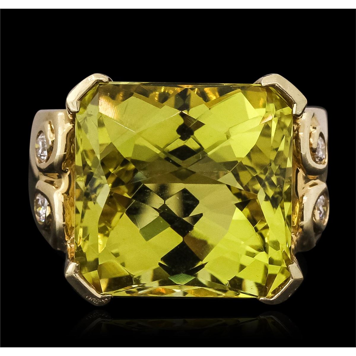 One electronically tested 14KT yellow gold ladies combination cast & assembled ring with a bright polish finish. Identified with markings of "14K". Condition is very good. Containing: One prong set square modified mixed cut natural citrine quartz, measuring 16.14 x 16.04 x 12.88mm, approximate weight of 22.17ct., clarity is eye clean, type I, medium light, moderately strong, yellowish green color, (GIA yO 4/4), cut is very good. Four bezel set round brilliant cut diamonds, measuring 2.10 - 2.10 x 1.26mm (depth est.) stated. Total Weight of 4 Stones = 0.14ct. Clarity: SI-1 to SI-2. Color: I - J, Cut is Good. Colored gemstones are presumed to have been subjected to commonly used enhancement processes. All diamonds and colored gemstones are graded in the mounting, unless otherwise stated. Total Weight of Colored Stones 22.17ct. Total Weight of Diamonds 0.14ct. Total Weight of Ring 16.00 grams. GGL Appraised at $6,700.00.