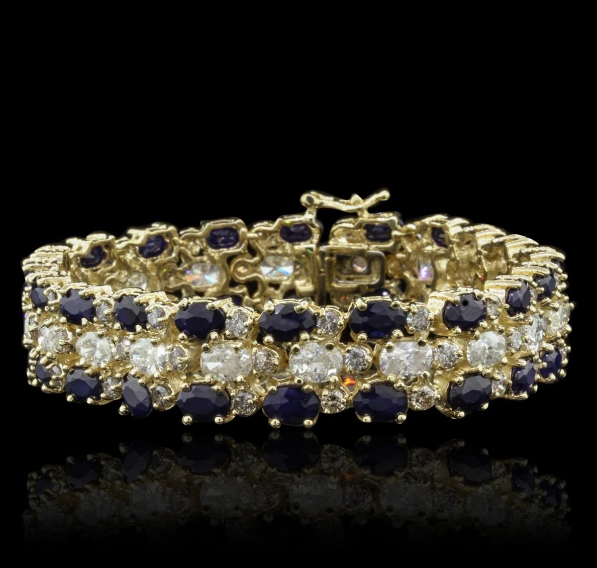One electronically tested 14KT yellow gold ladies cast & assembled sapphire and diamond bracelet with a bright polish finish. Condition is new, good workmanship. Seven and one-quarter inch length features a one-half inch wide flexible ribbon consisting of a series of oval sapphires and diamonds interspersed by round brilliant diamonds, terminating in a concealed clasp with safety. Identified with markings of "14K". Containing: Forty prong set oval mixed cut natural blue sapphires, measuring 6.00 x 4.00 x 2.55mm, 10%. bulge factor, approximate. Total Weight of 22.40ct., clarity is heavily included, type II, dark, moderately strong, violetish blue color, (GIA vB 7/4), cut is good. Transmitting light somewhat diffusely, transparent to translucent. Naturally occurring internal & external characteristics are present. Measurements & the color grade are an average for the group. Indications of multiple laboratory enhancements, including high temperature diffusion treatment. Graded in the setting. Twenty prong set oval shaped cut diamonds, measuring 5.80 x 4.20 x 3.00mm (depth est.) approximate. Total Weight of 20 Stones = 9.40ct. Graded in the setting. Clarity: I-1 to I-2. Color: H - J. Sixty prong set round brilliant cut diamonds, measuring 2.60 - 2.50 x 1.53mm (depth est.) approximate. Total Weight of 60 Stones = 3.75ct. Color grade is an average for the group. Graded in the setting. Clarity: I-1 to I-2. Total Weight of Colored Stones 22.40ct. Total Weight of Diamonds 13.15ct. Total Weight of Bracelet 35.17 grams. AIG Appraised at $48,370.00.