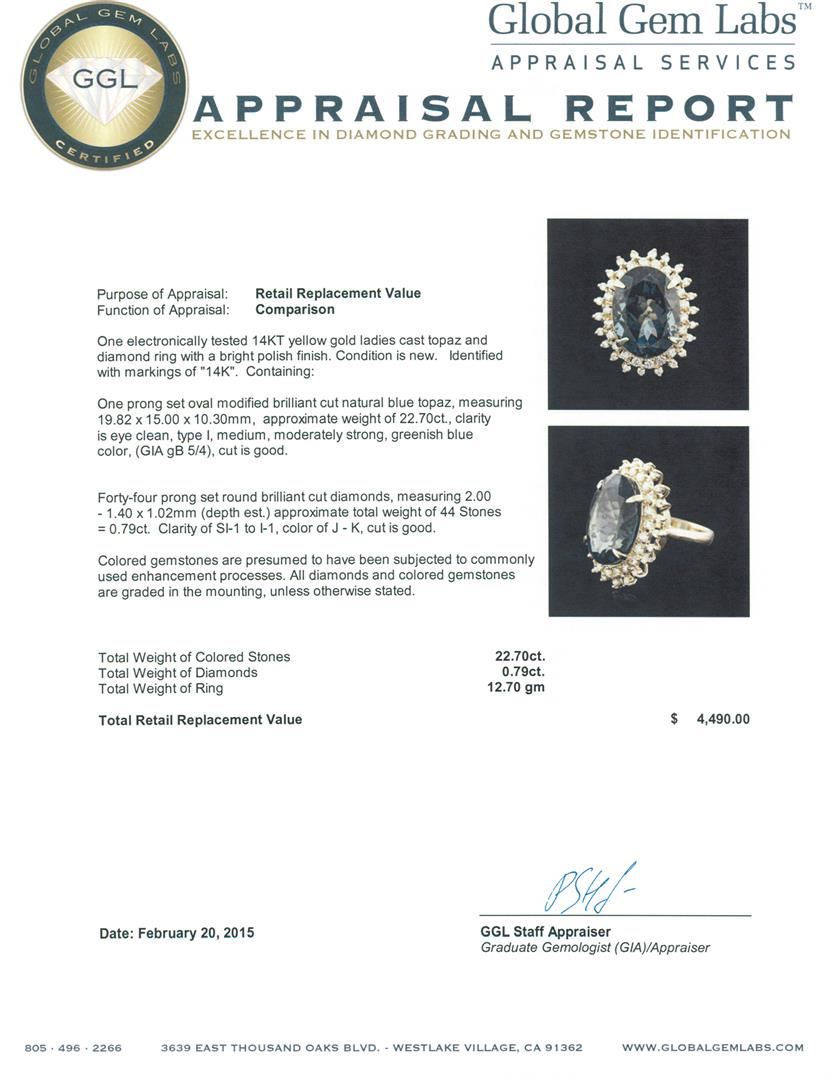 One electronically tested 14KT yellow gold ladies cast topaz and diamond ring with a bright polish finish. Identified with markings of "14K". Condition is new. Containing: One prong set oval modified brilliant cut natural blue topaz, measuring 19.82 x 15.00 x 10.30mm, approximate weight of 22.70 ct., clarity is eye clean, type I, medium, moderately strong, greenish blue color, (GIA gB 5/4), cut is good. Forty-Four prong set round brilliant cut diamonds, measuring 2.00 - 1.40 x 1.02mm (depth est.) approximate total weight of 44 Stones = 0.79ct. Clarity: SI-1 to I-1. Color: J - K, Cut is Good. Colored gemstones are presumed to have been subjected to commonly used enhancement processes. All diamonds and colored gemstones are graded in the mounting, unless otherwise stated. Total Weight of Colored Stones 22.70 ct. Total Weight of Diamonds 0.79ct. Total Weight of Ring 12.70 grams. GGL Appraised.