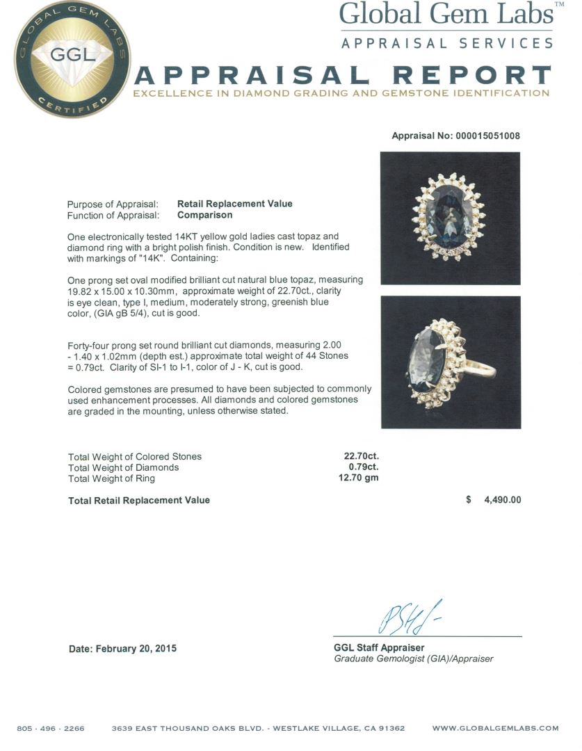 One electronically tested 14KT yellow gold ladies cast topaz and diamond ring with a bright polish finish. Identified with markings of "14K". Condition is new. Containing: One prong set oval modified brilliant cut natural blue topaz, measuring 19.82 x 15.00 x 10.30mm, approximate weight of 22.70ct., clarity is eye clean, type I, medium, moderately strong, greenish blue color, (GIA gB 5/4), cut is good. Forty-Four prong set round brilliant cut diamonds, measuring 2.00 - 1.40 x 1.02mm (depth est.) approximate total weight of 44 Stones = 0.79ct. Clarity: SI-1 to I-1. Color: J - K, Cut is Good. Colored gemstones are presumed to have been subjected to commonly used enhancement processes. All diamonds and colored gemstones are graded in the mounting, unless otherwise stated. Total Weight of Colored Stones 22.70ct. Total Weight of Diamonds 0.79ct. Total Weight of Ring 12.70 grams. GGL Appraised at $4,490.00.