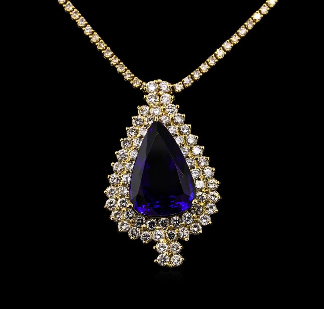 One electronically tested 14KT yellow gold Ladies combination cast & assembled necklace with a hidden box clasp with a bright polish finish. Condition is new. Measurements: 16" in length. Identified with markings of "14K". Containing: One prong set pear modified brilliant cut natural tanzanite, measuring 22.25 x 15.25 x 11.07mm, exact weight 23.05ct., clarity is eye clean, type I, medium dark, moderately strong, violetish blue color, (GIA vB 6/4), cut is very good. GIA Report: 2151735357. One Hundred Eighty prong set round brilliant cut diamonds, measuring 2.00 - 2.00 x 1.20mm (depth est.) approximate. Total Weight of 180 Stones = 5.26ct. Clarity: I-1 to I-2. Color: K - L, Cut is Good. Sixty-Two prong set round brilliant cut diamonds, measuring 2.90 - 2.50 x 1.62mm (depth est.) approximate. Total Weight of 62 Stones = 4.46ct. Clarity: I-1 to I-2. Color: J - L, Cut is Good. Total Weight of Colored Stones 23.05ct. Total Weight of Diamonds 9.72ct. Total Weight of Necklace 36.70 grams. GGL Appraised at $55,890.00.