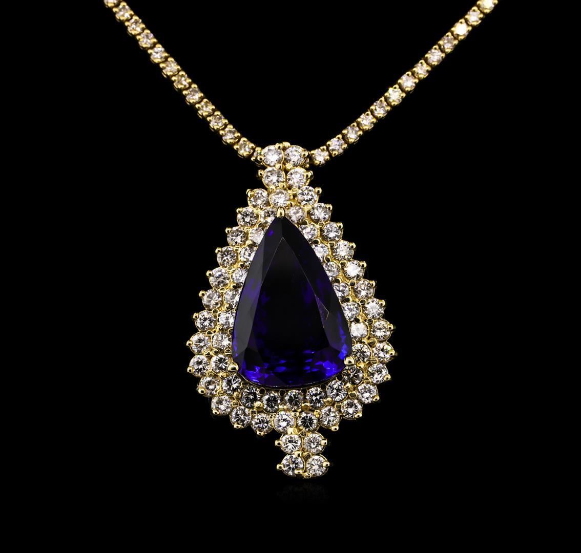 One electronically tested 14KT yellow gold Ladies combination cast & assembled necklace with a hidden box clasp with a bright polish finish. Condition is new. Measurements: 16" in length. Identified with markings of "14K". Containing: One prong set pear modified brilliant cut natural tanzanite, measuring 22.25 x 15.25 x 11.07mm, exact weight 23.05ct., clarity is eye clean, type I, medium dark, moderately strong, violetish blue color, (GIA vB 6/4), cut is very good. GIA Report: 2151735357. One Hundred Eighty prong set round brilliant cut diamonds, measuring 2.00 - 2.00 x 1.20mm (depth est.) approximate. Total Weight of 180 Stones = 5.26ct. Clarity: I-1 to I-2. Color: K - L, Cut is Good. Sixty-Two prong set round brilliant cut diamonds, measuring 2.90 - 2.50 x 1.62mm (depth est.) approximate. Total Weight of 62 Stones = 4.46ct. Clarity: I-1 to I-2. Color: J - L, Cut is Good. Total Weight of Colored Stones 23.05ct. Total Weight of Diamonds 9.72ct. Total Weight of Necklace 36.70 grams. GGL Appraised.