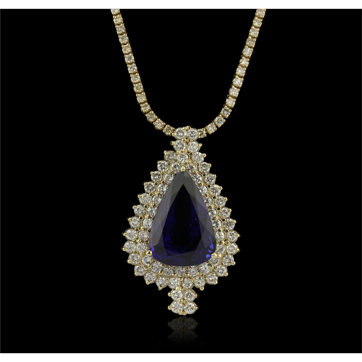 One electronically tested 14KT yellow gold Ladies combination cast & assembled necklace with a hidden box clasp with a bright polish finish. Condition is new. Measurements: 16" in length. Identified with markings of "14K". Containing: One prong set pear modified brilliant cut natural tanzanite, measuring 22.25 x 15.25 x 11.07mm, exact weight 23.05ct., clarity is eye clean, type I, medium dark, moderately strong, violetish blue color, (GIA vB 6/4), cut is very good. GIA Report: 2151735357. One Hundred Eighty prong set round brilliant cut diamonds, measuring 2.00 - 2.00 x 1.20mm (depth est.) approximate. Total Weight of 180 Stones = 5.26ct. Clarity: I-1 to I-2. Color: K - L, Cut is Good. Sixty-Two prong set round brilliant cut diamonds, measuring 2.90 - 2.50 x 1.62mm (depth est.) approximate. Total Weight of 62 Stones = 4.46ct. Clarity: I-1 to I-2. Color: J - L, Cut is Good. Total Weight of Colored Stones 23.05ct. Total Weight of Diamonds 9.72ct. Total Weight of Necklace 36.70 grams. GGL Appraised at $55,890.00.