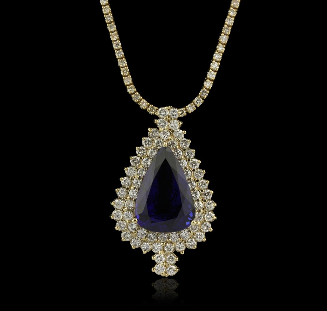 One electronically tested 14KT yellow gold Ladies combination cast & assembled necklace with a hidden box clasp with a bright polish finish. Condition is new. Measurements: 16" in length. Identified with markings of "14K". Containing: One prong set pear modified brilliant cut natural tanzanite, measuring 22.25 x 15.25 x 11.07mm, exact weight 23.05ct., clarity is eye clean, type I, medium dark, moderately strong, violetish blue color, (GIA vB 6/4), cut is very good. GIA Report: 2151735357. One Hundred Eighty prong set round brilliant cut diamonds, measuring 2.00 - 2.00 x 1.20mm (depth est.) approximate. Total Weight of 180 Stones = 5.26ct. Clarity: I-1 to I-2. Color: K - L, Cut is Good. Sixty-Two prong set round brilliant cut diamonds, measuring 2.90 - 2.50 x 1.62mm (depth est.) approximate. Total Weight of 62 Stones = 4.46ct. Clarity: I-1 to I-2. Color: J - L, Cut is Good. Total Weight of Colored Stones 23.05ct. Total Weight of Diamonds 9.72ct. Total Weight of Necklace 36.70 grams. GGL Appraised at $55,890.00.
