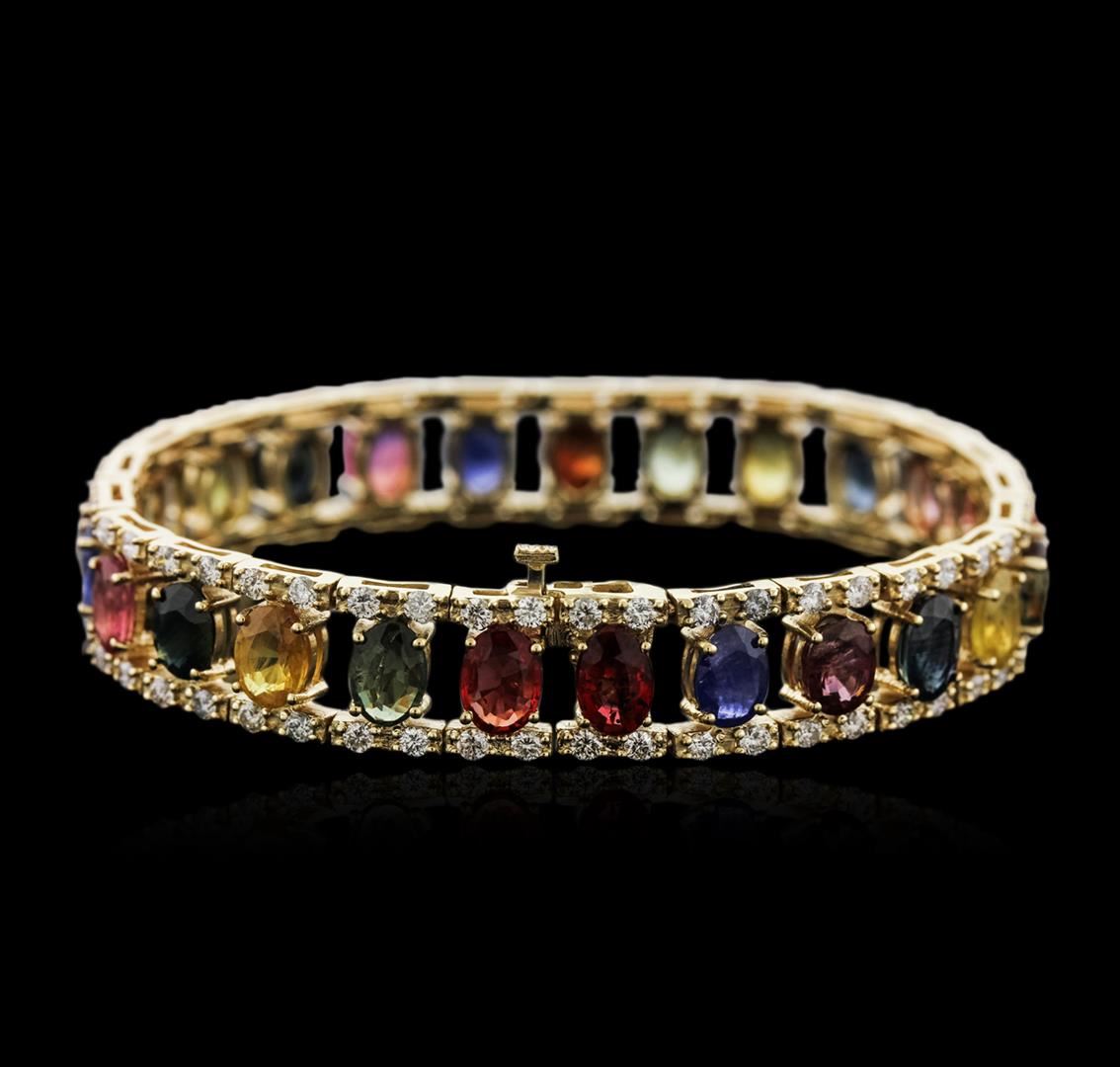 One electronically tested 14KT yellow gold ladies cast sapphire and diamond bracelet with a hidden box clasp with a bright polish finish. Measurements: 7" in length Identified with markings of "14K". Condition is new. Containing: Twenty-five prong set oval modified brilliant cut natural multicolor sapphires, measuring 6.80 x 5.00 x 3.25mm, approximate total weight of 23.25ct., clarity is slightly included, type II, medium light, moderately strong, violet color, (GIA V 4/4), cut is good. One Hundred prong set round brilliant cut diamonds, measuring 1.80 - 1.80 x 1.08mm (depth est.) approximate total weight of 100 Stones = 2.13ct. Clarity: SI-1 to I-1. Color: H - I, Cut is Good. Colored gemstones are presumed to have been subjected to commonly used enhancement processes. All diamonds and colored gemstones are graded in the mounting, unless otherwise stated. Total Weight of Colored Stones 23.25ct. Total Weight of Diamonds 2.13ct. Total Weight of Bracelet 27.90 grams. GGL Appraised at $13,585.00.