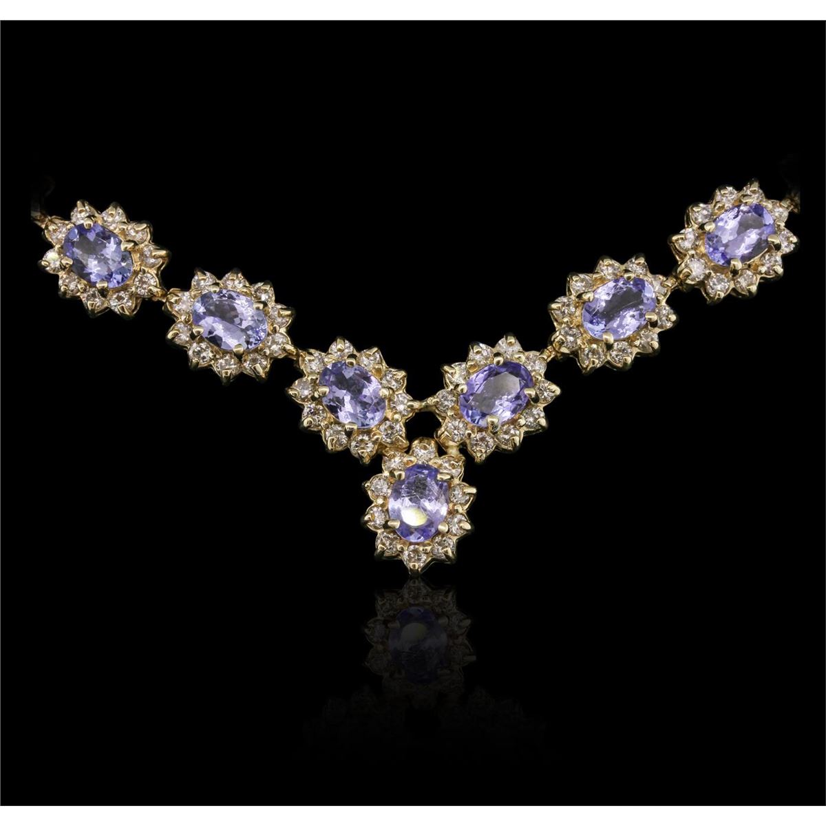 One electronically tested 14KT yellow gold ladies cast & assembled tanzanite and diamond necklace. Condition is new, good workmanship. Seventeen and one-half inch length necklace features a chevron style tanzanite and diamond floret ribbon, terminating in a concealed clasp with safety. Bright polish finish. Identified with markings of "14K". Containing: Thirty-five prong set oval mixed cut natural tanzanites, measuring 7.00 x 5.00 x 2.95mm, approximate. Total Weight of 24.95ct., clarity is eye clean, type I, medium dark, very slightly grayish, bluish violet color, (GIA bV 6/3), cut is good. Transmitting light with no distortion, transparent. Measurements & the color grade are an average for the group. Graded in the setting. Tanzanite is a very rare gemstone that is only found in the country of Tanzania. Originally discovered in 1967. Tiffany & Company, named the stone Tanzanite. It is found in the Usumburu Mountains that border the Umba Valley of northern Tanzania. Tanzanite occurs in gray, brown, violet, blue, reddish-purple, & green. The gem is interesting because of its exceptional pleochroism. Rotated in different directions a tanzanite will exhibit multiple changes of color. Tanzanite has a low tolerance to ultrasonic cleaning, and should not be cleaned using this method. Three Hundred Fifty prong set round brilliant cut diamonds, measuring 2.10 - 2.00 x 1.23mm (depth est.) approximate. Total Weight of 350 Stones = 11.12ct. Graded in the setting. Clarity: SI-1 to I-1. Color: H - J. Total Weight of Colored Stones 24.95ct. Total Weight of Diamonds 11.12ct. Total Weight of Necklace 55.81 grams. AIG Appraised at $57,995.00.