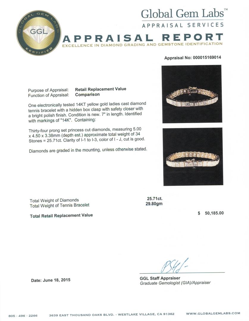 One electronically tested 14KT yellow gold ladies cast diamond tennis bracelet with a hidden box clasp with safety closer with a bright polish finish. 7" in length. Identified with markings of "14K". Condition is new. Containing: Thirty-Four prong set princess cut diamonds, measuring 5.00 x 4.50 x 3.38mm (depth est.) approximate total weight of 34 Stones = 25.71ct. Clarity: I-1 to I-3. Color: I - J, Cut is Good. Diamonds are graded in the mounting, unless otherwise stated. Total Weight of Diamonds 25.71ct. Total Weight of Tennis Bracelet 29.80 grams. GGL Appraised at $50,185.00.