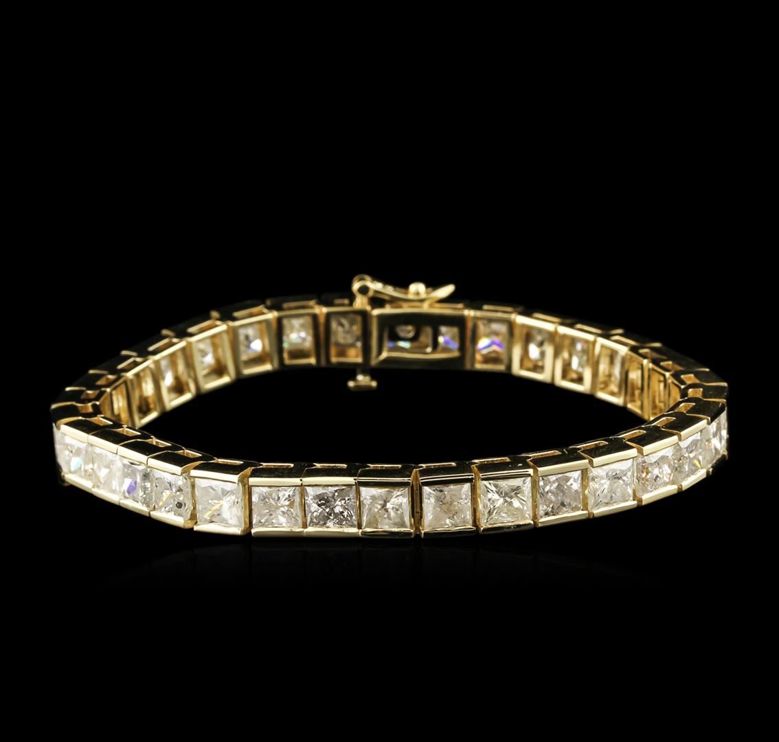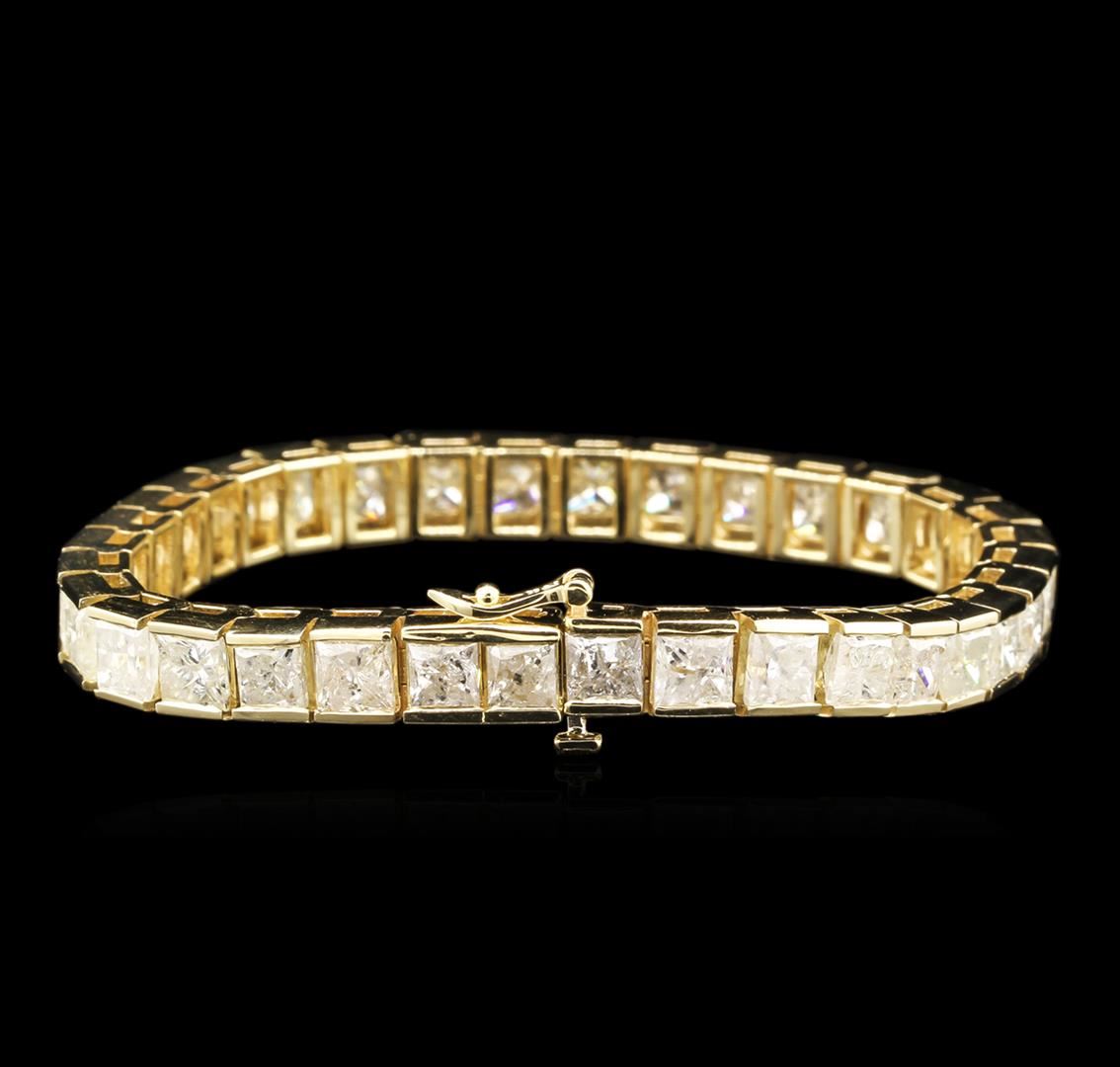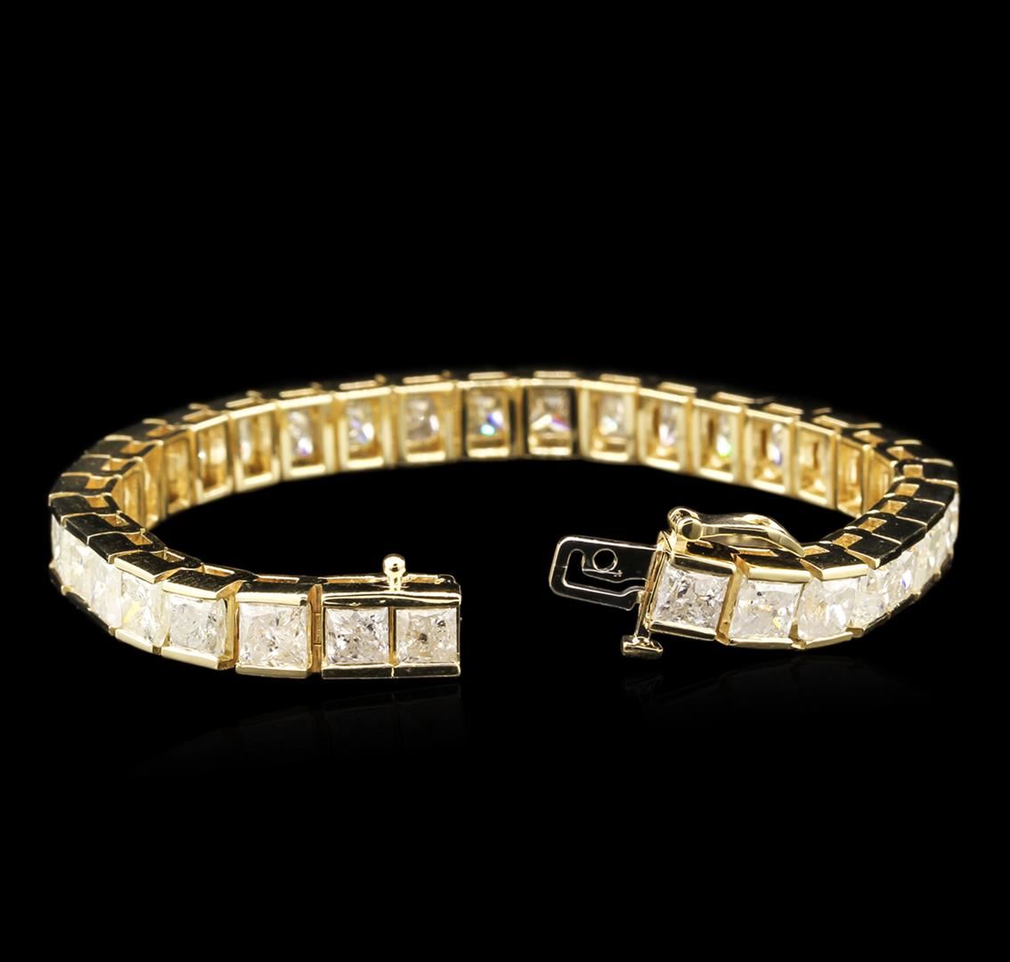 One electronically tested 14KT yellow gold ladies cast diamond tennis bracelet with a hidden box clasp with safety closer with a bright polish finish. 7" in length. Identified with markings of "14K". Condition is new. Containing: Thirty-Four prong set princess cut diamonds, measuring 5.00 x 4.50 x 3.38mm (depth est.) approximate total weight of 34 Stones = 25.71ct. Clarity: I-1 to I-3. Color: I - J, Cut is Good. Diamonds are graded in the mounting, unless otherwise stated. Total Weight of Diamonds 25.71ct. Total Weight of Tennis Bracelet 29.80 grams. GGL Appraised at $50,185.00.