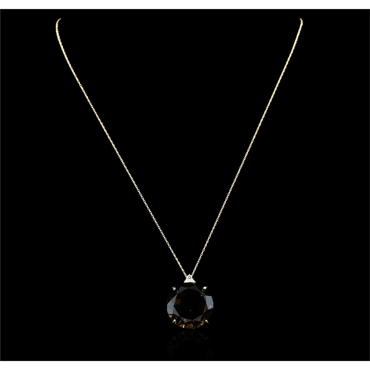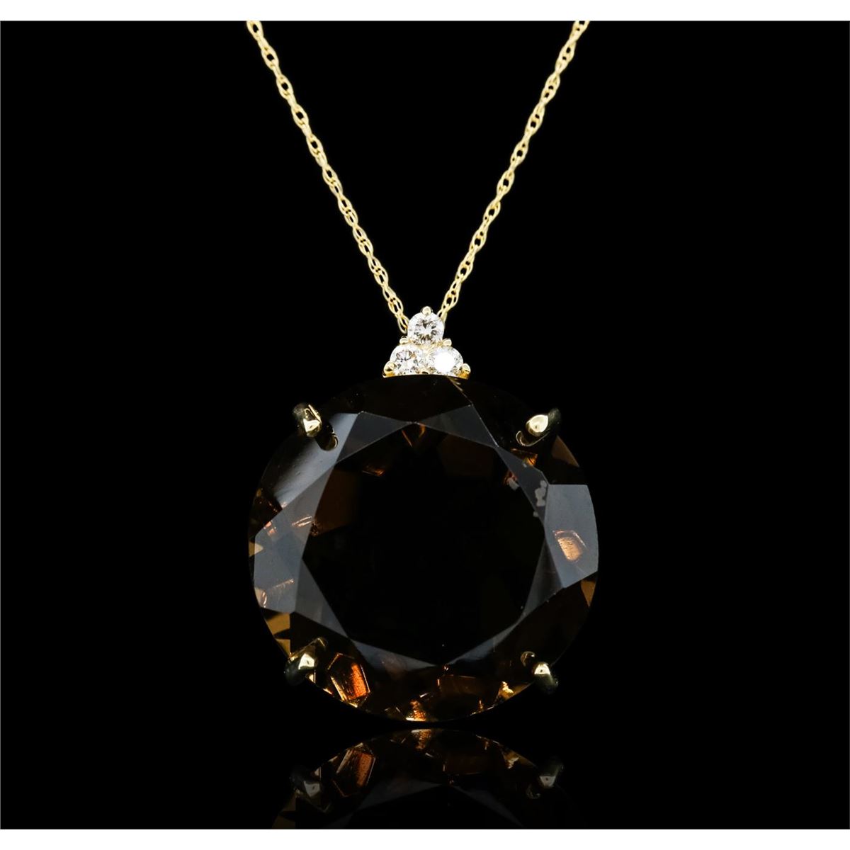 One pendant with chain featuring: 14KT yellow gold weighing 9.80 grams containing one smokey topaz with a total weight of 26.18ct and round diamonds with a total weight of 0.10cts.