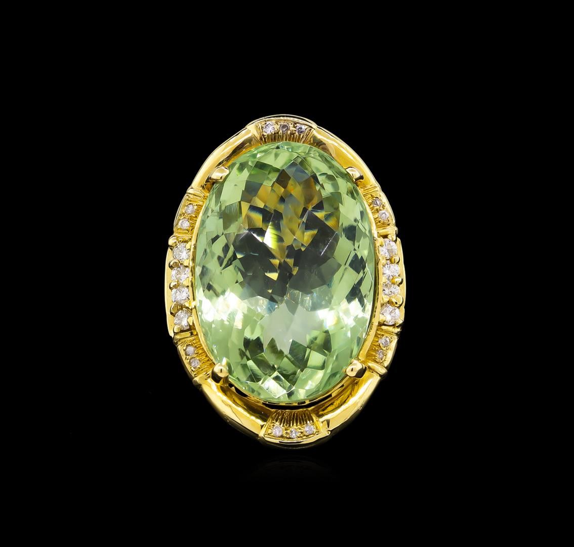 One electronically tested 14KT yellow gold ladies cast green quartz and diamond ring with a bright polish finish. Condition is new, good workmanship. The featured green quartz is set within a diamond bezel, supported by split shoulders and completed by a three and one-half millimeter wide band. Identified with markings of "K14". Containing: One prong set oval mixed cut natural green quartz, measuring 23.30 x 15.80 x 12.50mm, 8%. bulge factor, approximate weight of 27.45ct., clarity is eye clean, medium, very slightly grayish, very slightly bluish green color, (GIA vslbG 5/3), cut is good. Transmitting light with no distortion, transparent. Colored Stone Grading Report attached. Graded in the setting Eight prong set round brilliant cut diamonds, measuring 2.00 - 1.90 x 1.17mm (depth est.) approximate total weight of 8 Stones = 0.31ct. Graded in the setting. Clarity: I-1 to I-2 . Color: G - I Fourteen bead set round brilliant cut diamonds, measuring 1.10 - 1.00 x 0.63mm (depth est.) approximate total weight of 14 Stones = 0.60ct. Graded in the setting. Clarity: I-2 to I-3 . Color: G - I. Total Weight of Colored Stones 27.45ct. Total Weight of Diamonds 0.91ct. Total Weight of Ring 13.80 grams. AIG Appraised at $4,105.00.