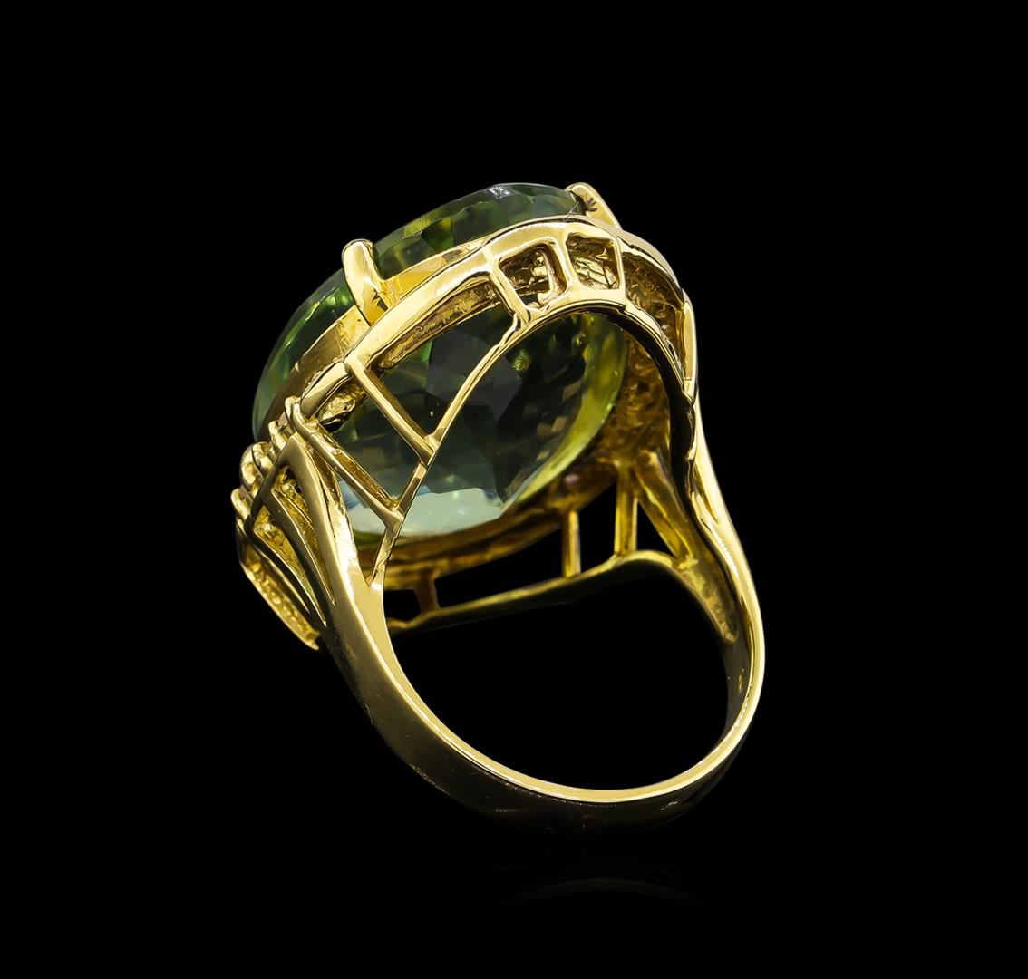 One electronically tested 14KT yellow gold ladies cast green quartz and diamond ring with a bright polish finish. Condition is new, good workmanship. The featured green quartz is set within a diamond bezel, supported by split shoulders and completed by a three and one-half millimeter wide band. Identified with markings of "K14". Containing: One prong set oval mixed cut natural green quartz, measuring 23.30 x 15.80 x 12.50mm, 8%. bulge factor, approximate weight of 27.45ct., clarity is eye clean, medium, very slightly grayish, very slightly bluish green color, (GIA vslbG 5/3), cut is good. Transmitting light with no distortion, transparent. Colored Stone Grading Report attached. Graded in the setting Eight prong set round brilliant cut diamonds, measuring 2.00 - 1.90 x 1.17mm (depth est.) approximate total weight of 8 Stones = 0.31ct. Graded in the setting. Clarity: I-1 to I-2 . Color: G - I Fourteen bead set round brilliant cut diamonds, measuring 1.10 - 1.00 x 0.63mm (depth est.) approximate total weight of 14 Stones = 0.60 ct. Graded in the setting. Clarity: I-2 to I-3 . Color: G - I. Total Weight of Colored Stones 27.45ct. Total Weight of Diamonds 0.91ct. Total Weight of Ring 13.80 grams. AIG Appraised.