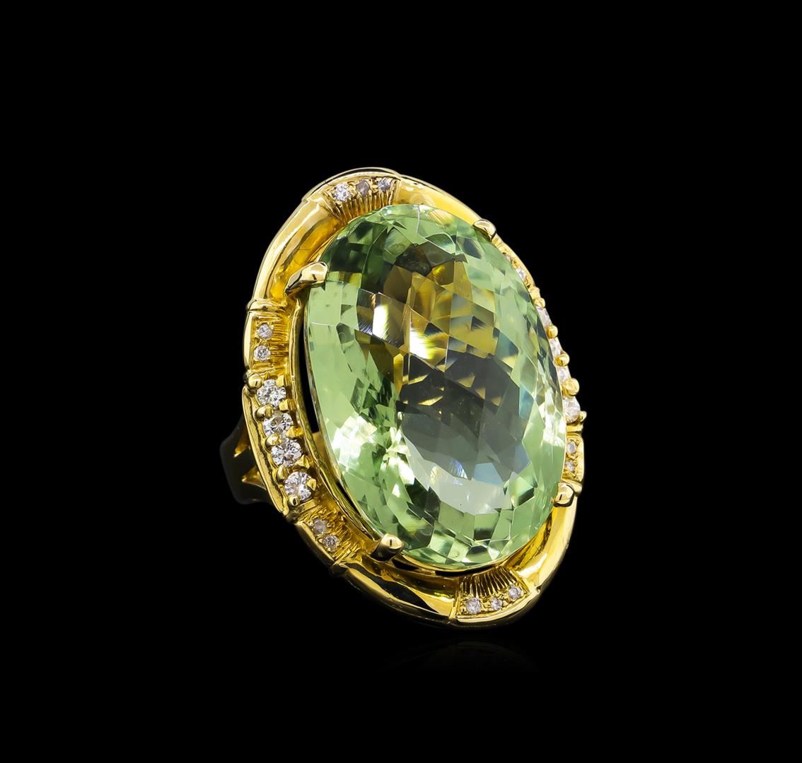 One electronically tested 14KT yellow gold ladies cast green quartz and diamond ring with a bright polish finish. Condition is new, good workmanship. The featured green quartz is set within a diamond bezel, supported by split shoulders and completed by a three and one-half millimeter wide band. Identified with markings of "K14". Containing: One prong set oval mixed cut natural green quartz, measuring 23.30 x 15.80 x 12.50mm, 8%. bulge factor, approximate weight of 27.45ct., clarity is eye clean, medium, very slightly grayish, very slightly bluish green color, (GIA vslbG 5/3), cut is good. Transmitting light with no distortion, transparent. Colored Stone Grading Report attached. Graded in the setting Eight prong set round brilliant cut diamonds, measuring 2.00 - 1.90 x 1.17mm (depth est.) approximate total weight of 8 Stones = 0.31ct. Graded in the setting. Clarity: I-1 to I-2 . Color: G - I Fourteen bead set round brilliant cut diamonds, measuring 1.10 - 1.00 x 0.63mm (depth est.) approximate total weight of 14 Stones = 0.60 ct. Graded in the setting. Clarity: I-2 to I-3 . Color: G - I. Total Weight of Colored Stones 27.45ct. Total Weight of Diamonds 0.91ct. Total Weight of Ring 13.80 grams. AIG Appraised.
