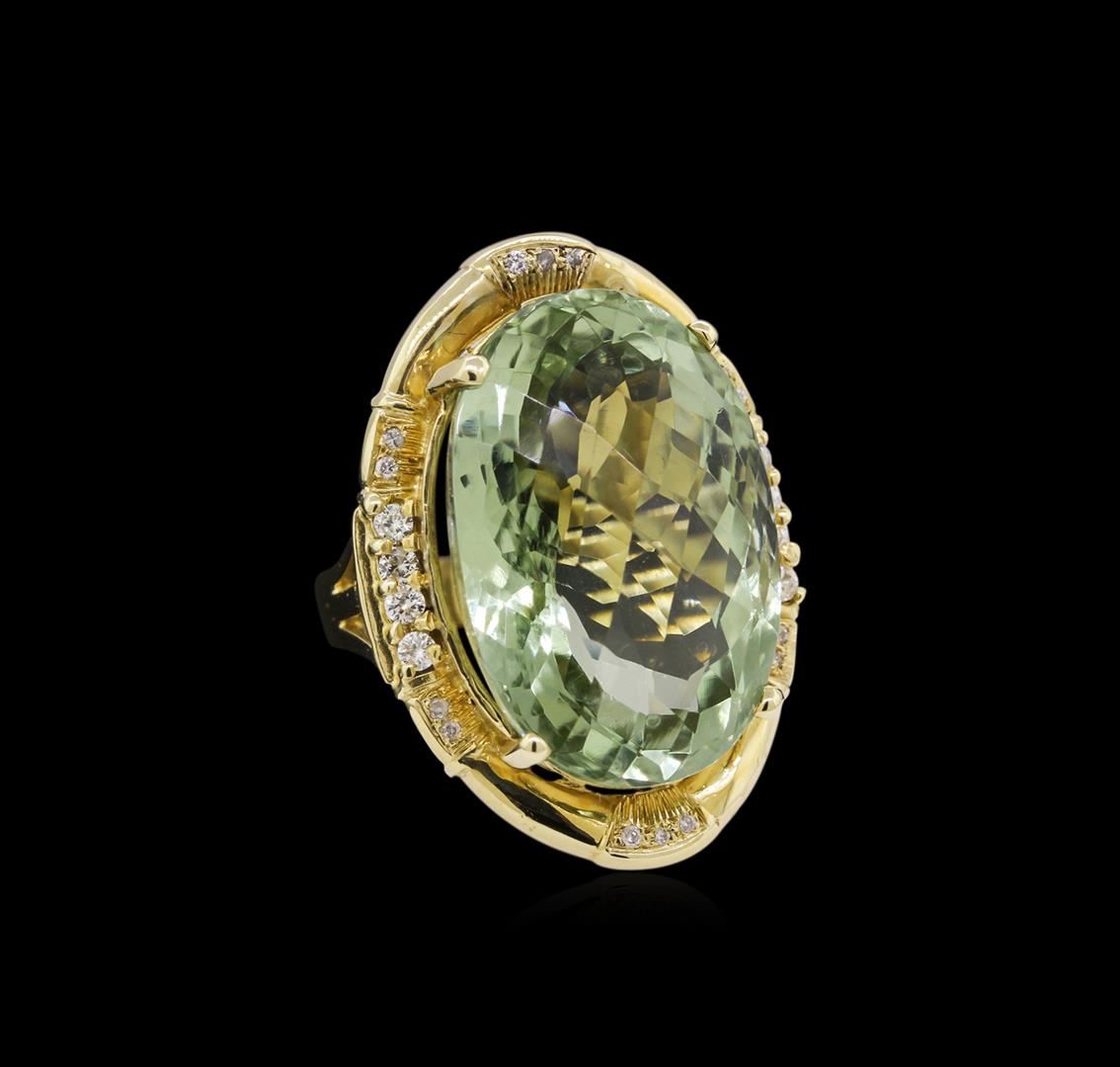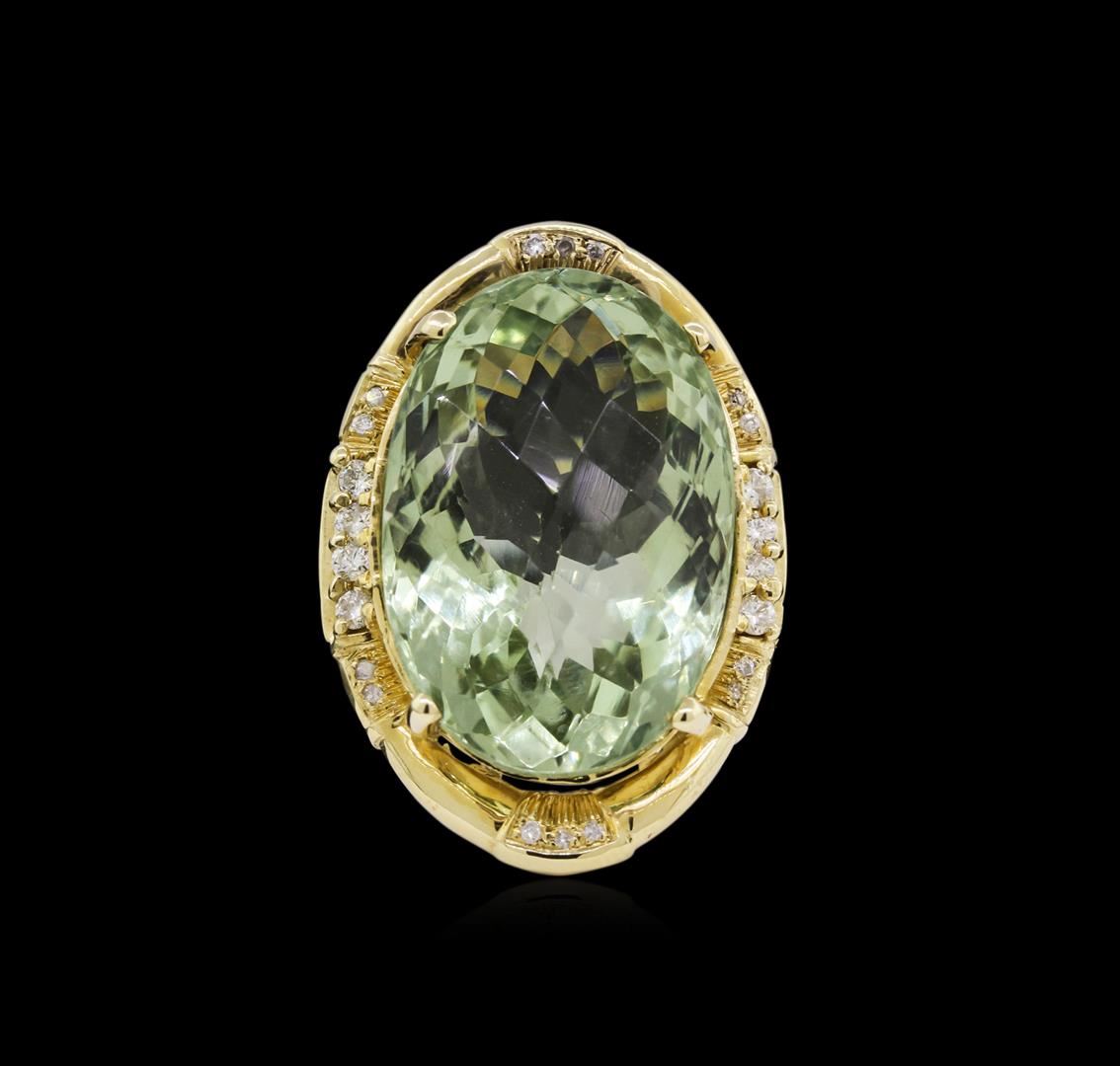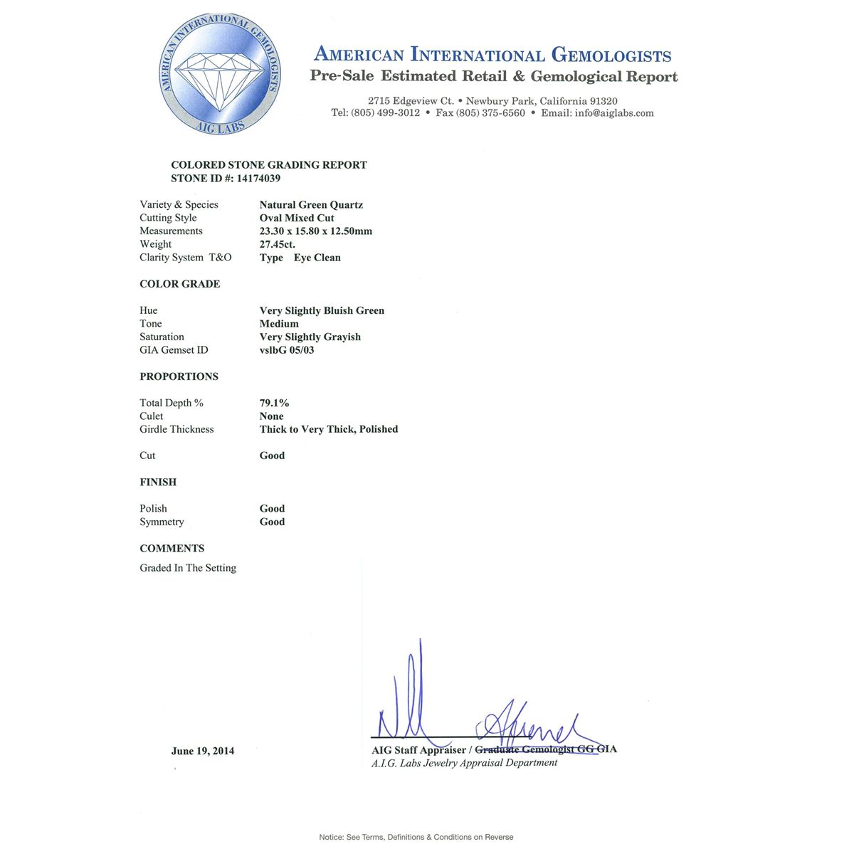 One electronically tested 14KT yellow gold ladies cast green quartz and diamond ring with a bright polish finish. Condition is new, good workmanship. The featured green quartz is set within a diamond bezel, supported by split shoulders and completed by a three and one-half millimeter wide band. Identified with markings of "K14". Containing: One prong set oval mixed cut natural green quartz, measuring 23.30 x 15.80 x 12.50mm, 8%. bulge factor, approximate weight of 27.45ct., clarity is eye clean, medium, very slightly grayish, very slightly bluish green color, (GIA vslbG 5/3), cut is good. Transmitting light with no distortion, transparent. Colored Stone Grading Report attached. Graded in the setting Eight prong set round brilliant cut diamonds, measuring 2.00 - 1.90 x 1.17mm (depth est.) approximate total weight of 8 Stones = 0.31ct. Graded in the setting. Clarity: I-1 to I-2 . Color: G - I Fourteen bead set round brilliant cut diamonds, measuring 1.10 - 1.00 x 0.63mm (depth est.) approximate total weight of 14 Stones = 0.60ct. Graded in the setting. Clarity: I-2 to I-3 . Color: G - I. Total Weight of Colored Stones 27.45ct. Total Weight of Diamonds 0.91ct. Total Weight of Ring 13.80 grams. AIG Appraised at $4,105.00.