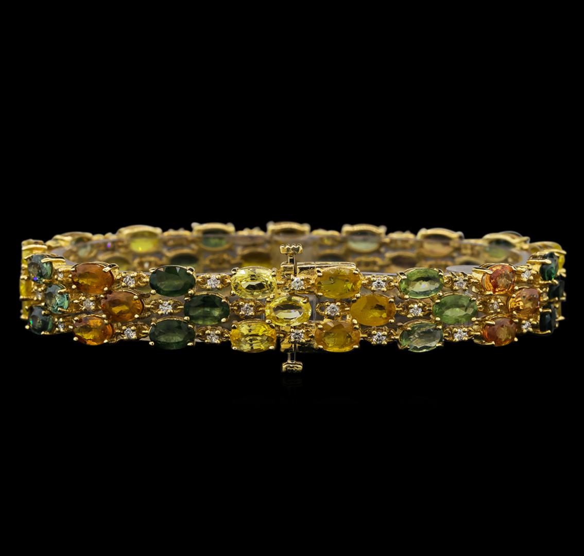 One electronically tested 14KT yellow gold ladies combination cast & assembled sapphire and diamond bracelet with a hidden box clasp with a bright polish finish. Bracelet measures 7-1/2" in length and 1/2" width. Condition is new. Containing: Fifty-one prong set oval modified brilliant cut natural sapphires, measuring 5.90 x 4.00 x 2.60mm, exact total weight 28.17ct., clarity is slightly included, type II, medium light, brownish, green, orange, pink and yellow color, (GIA Y 4/3), cut is good. Fifty-One prong set round brilliant cut diamonds, measuring 1.50 - 1.50 x 0.90mm (depth est.) approximate total weight of 51 Stones = 0.97ct. Clarity: SI-1 to SI-2. Color: J - K, Cut is Good. All diamonds and colored gemstones are graded in the mounting, unless otherwise stated. Colored gemstones are presumed to have been subjected to commonly used enhancement processes.. Total Weight of Colored Stones 28.17ct. Total Weight of Diamonds 0.97ct. Total Weight of Bracelet 25.90 grams. GGL Appraised at $8,410.00.