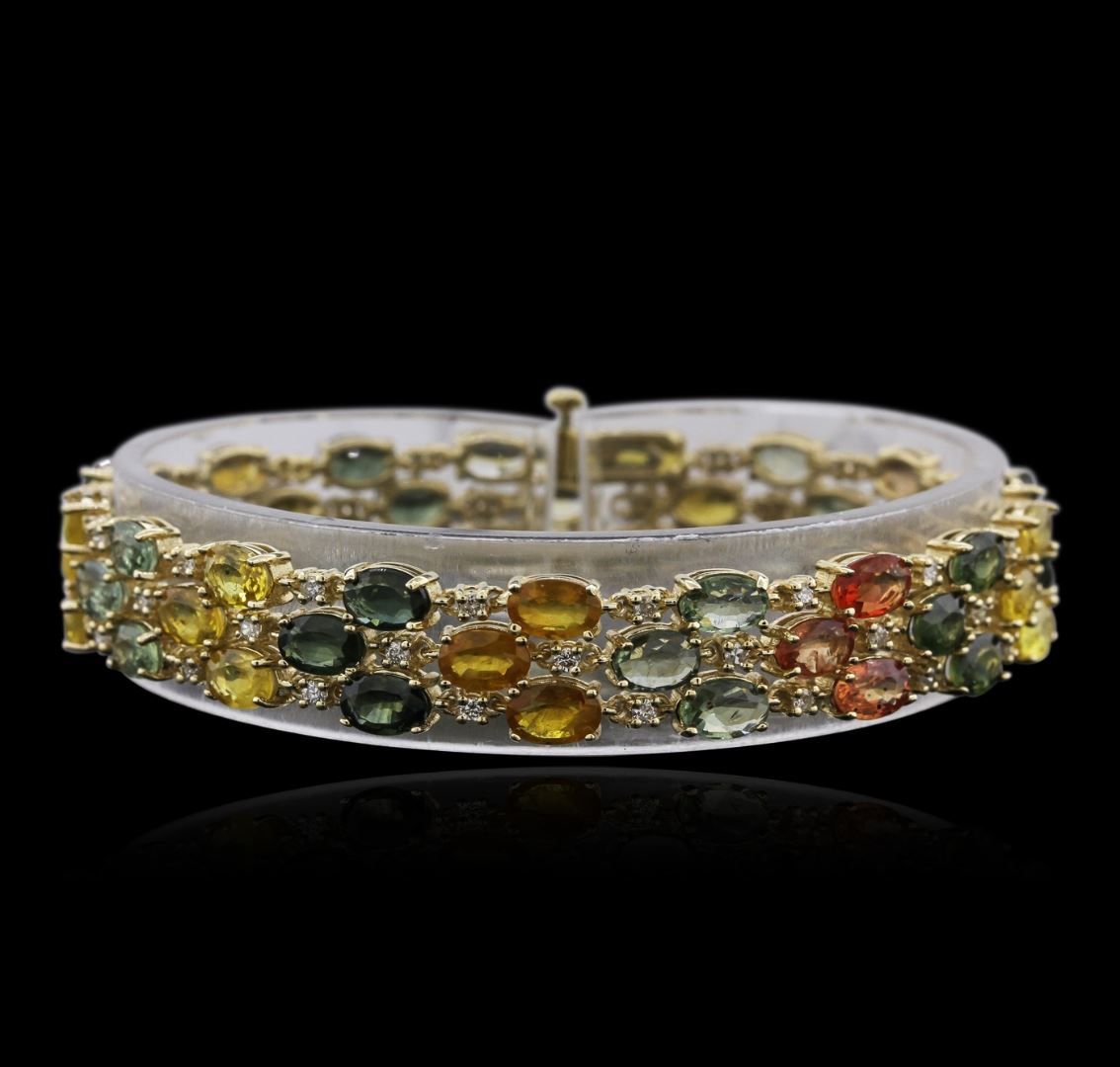 One electronically tested 14KT yellow gold ladies combination cast & assembled sapphire and diamond bracelet with a hidden box clasp with a bright polish finish. Bracelet measures 7-1/2" in length and 1/2" width. Condition is new. Containing: Fifty-one prong set oval modified brilliant cut natural sapphires, measuring 5.90 x 4.00 x 2.60mm, exact total weight 28.17ct., clarity is slightly included, type II, medium light, brownish, green, orange, pink and yellow color, (GIA Y 4/3), cut is good. Fifty-One prong set round brilliant cut diamonds, measuring 1.50 - 1.50 x 0.90mm (depth est.) approximate total weight of 51 Stones = 0.97ct. Clarity: SI-1 to SI-2. Color: J - K, Cut is Good. All diamonds and colored gemstones are graded in the mounting, unless otherwise stated. Colored gemstones are presumed to have been subjected to commonly used enhancement processes.. Total Weight of Colored Stones 28.17ct. Total Weight of Diamonds 0.97ct. Total Weight of Bracelet 25.90 grams. GGL Appraised at $8,410.00.