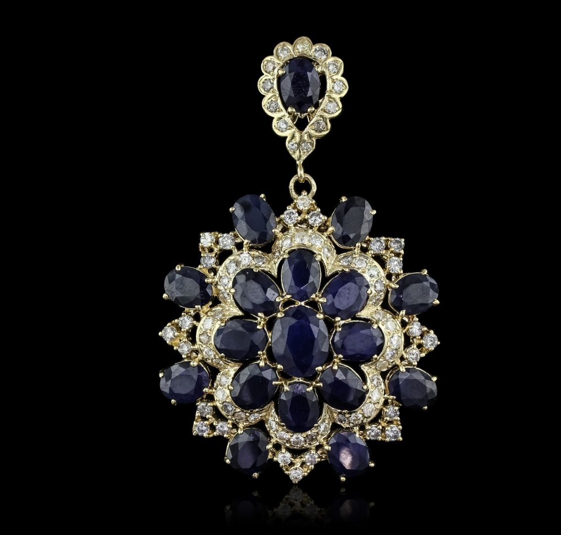 One electronically tested 14KT yellow gold Ladies combination cast & assembled pendant with a bright polish finish. Condition is new. Identified with markings of "K14". Containing: Seventeen prong set oval modified brilliant cut natural blue sapphires, measuring 7.80 x 5.90 x 3.84mm, approximate. Total Weight of 24.48ct., clarity is heavily included, type II, dark, moderately strong, blue color, (GIA B 7/4), cut is good. One prong set oval modified brilliant cut natural blue sapphire, measuring 10.50 x 8.50 x 5.53mm, approximate weight of 3.99ct., clarity is heavily included, type II, dark, moderately strong, blue color, (GIA B 7/4), cut is good. Colored gemstones are presumed to have been subjected to commonly used color/clarity enhancement processes. Seventy-Seven prong set round brilliant cut diamonds, measuring 2.20 - 2.00 x 1.26mm (depth est.) approximate. Total Weight of 77 Stones = 2.61ct. Clarity: I-2 to I-3. Color: I - J, Cut is Good. Total Weight of Colored Stones 28.47ct. Total Weight of Diamonds 2.61ct. Total Weight of Pendant 24.40 grams. GGL Appraised at $21,925.00.