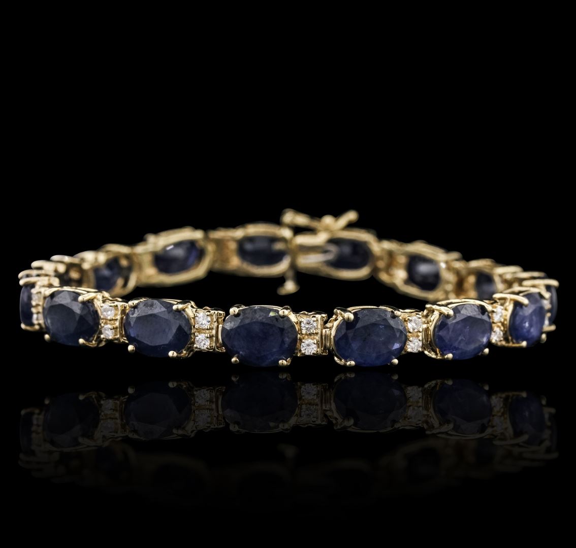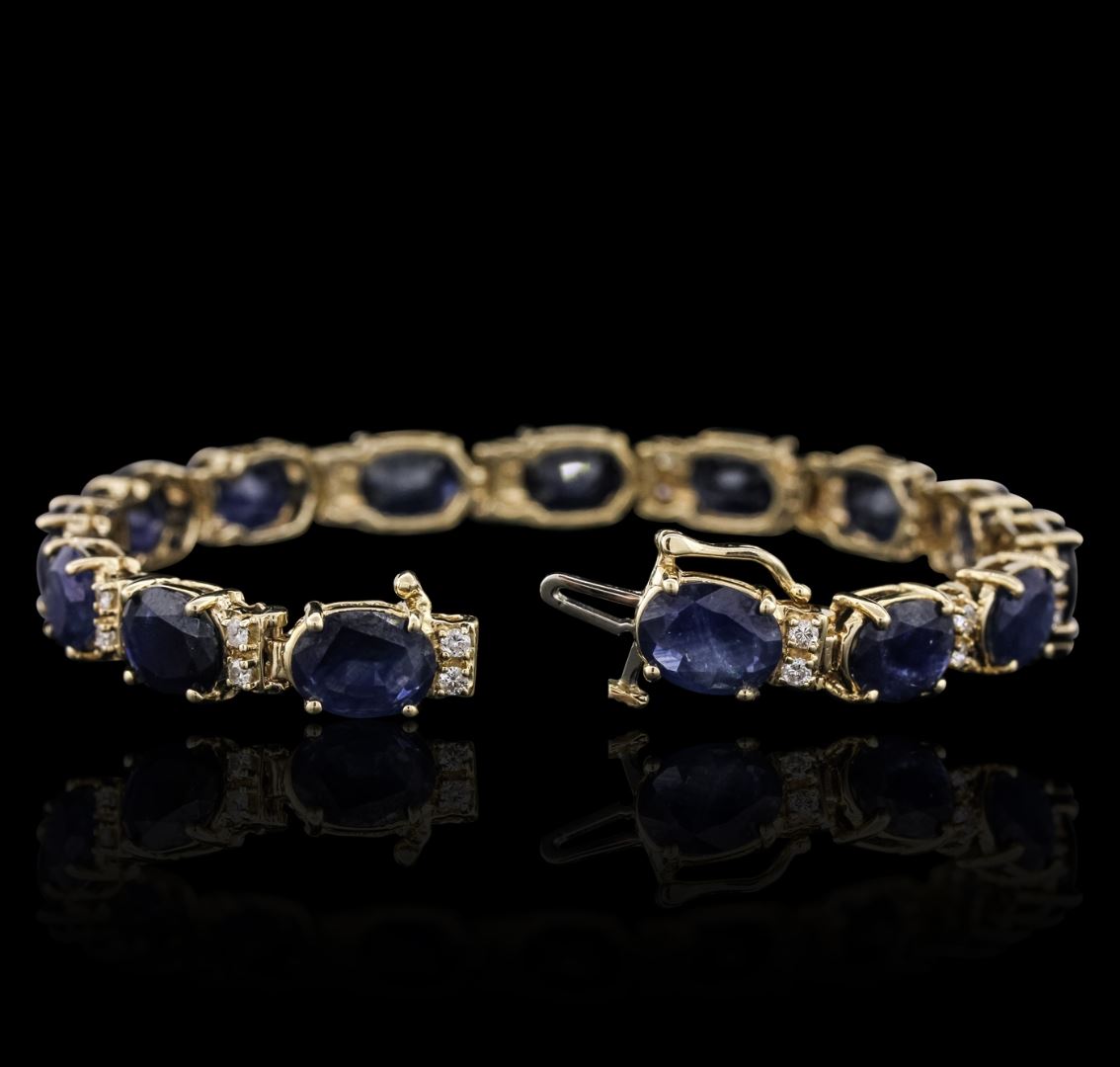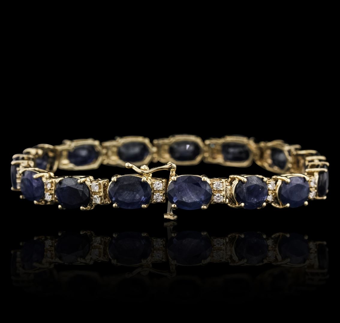 One electronically tested 14KT yellow gold ladies combination cast & assembled bracelet with a bright polish finish. Measurements: 7.25" in length. Identified with markings of "14K". Condition is new. Containing: Fifteen prong set oval modified brilliant cut natural blue sapphires, measuring 8.80 x 6.80 x 3.90mm, approximate total weight of 28.50ct., clarity is heavily included, type II, medium dark, moderately strong, blue color, (GIA B 6/4), cut is good. Thirty prong set round brilliant cut diamonds, measuring 1.60 - 1.60 x 0.96mm (depth est.) approximate total weight of 30 Stones = 0.78ct. Clarity: I-1 to I-2. Color: J - K, Cut is Good. Colored gemstones are presumed to have been subjected to commonly used enhancement processes. All diamonds and colored gemstones are graded in the mounting, unless otherwise stated. Total Weight of Colored Stones 28.50ct. Total Weight of Diamonds 0.78ct. Total Weight of Bracelet 19.90 grams. GGL Appraised at $18,560.00.