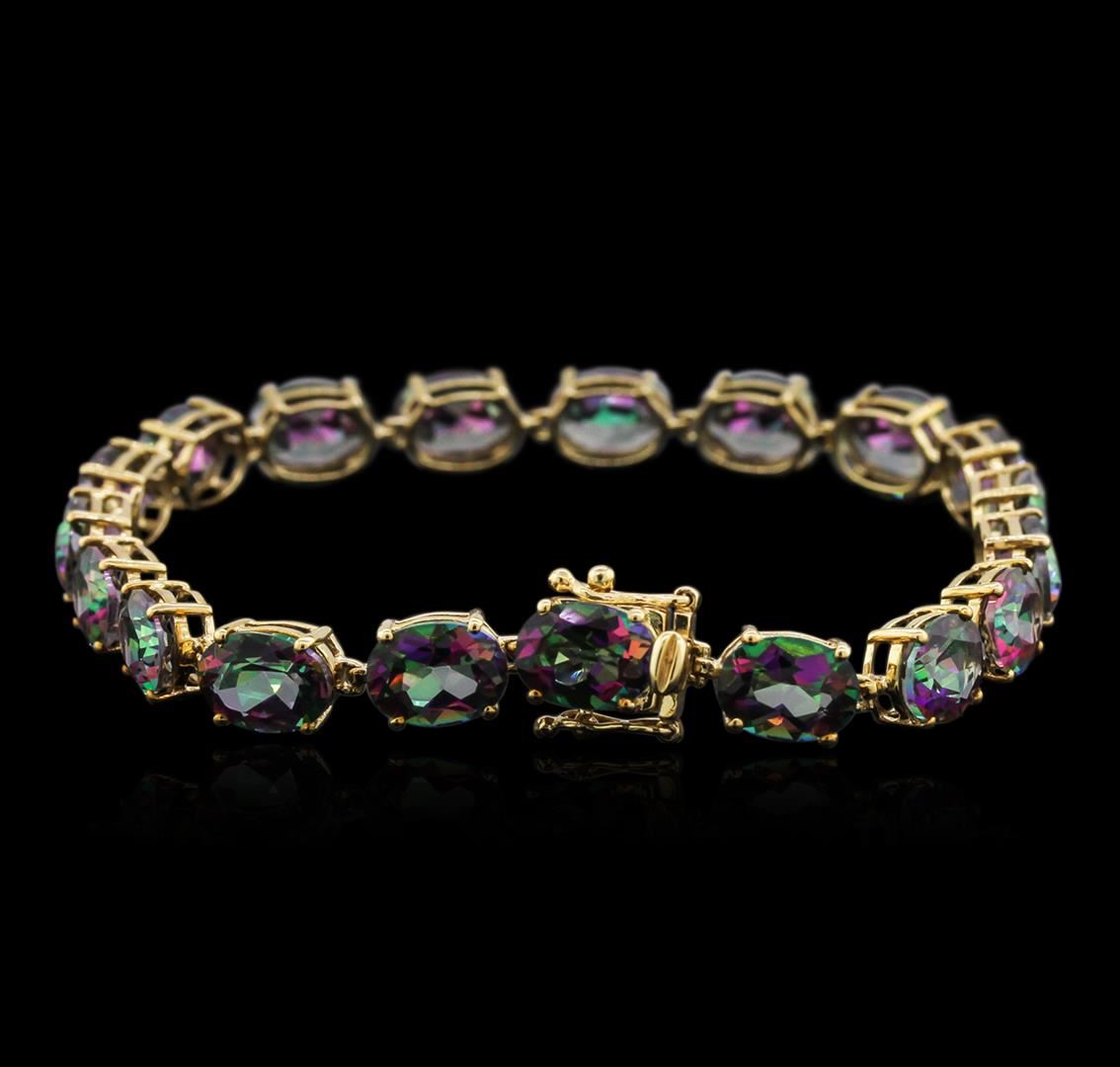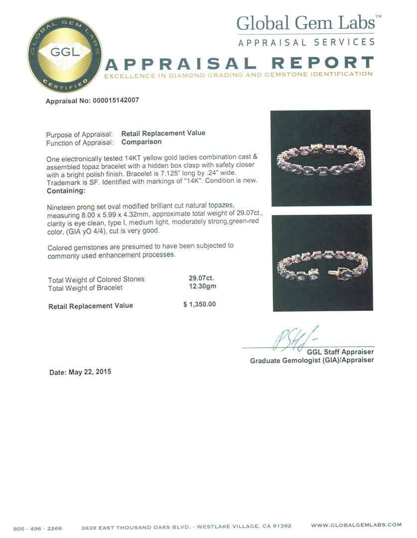 One electronically tested 14KT yellow gold ladies combination cast & assembled topaz bracelet with a hidden box clasp with safety closer with a bright polish finish. Bracelet is 7.125" long by .24" wide. Trademark is SF. Identified with markings of "14K". Condition is new. Containing: Nineteen prong set oval modified brilliant cut natural topazes, measuring 8.00 x 5.99 x 4.32mm, approximate total weight of 29.07ct., clarity is eye clean, type I, medium light, moderately strong, green-red color, (GIA yO 4/4), cut is very good. Colored gemstones are presumed to have been subjected to commonly used enhancement processes. Total Weight of Colored Stones 29.07ct. Total Weight of Bracelet 12.30 grams. GGL Appraised at $1,350.00.