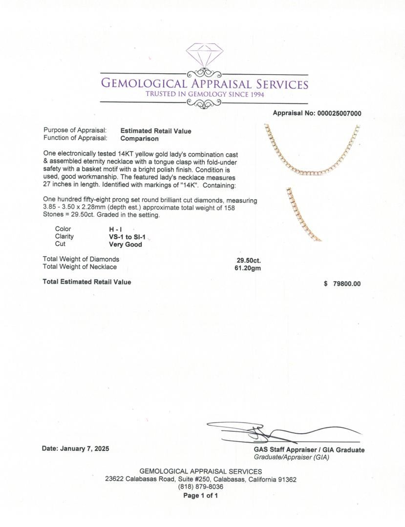This exquisite 14KT yellow gold eternity necklace features a timeless design with a secure tongue clasp and fold-under safety. The piece showcases 158 round brilliant cut diamonds, totaling an impressive 29.50 carats, meticulously prong-set along the entire length of the 27-inch chain. Each diamond is graded H-I in color and VS-1 to SI-1 in clarity, exhibiting exceptional brilliance and fire. The basket motif setting enhances the structural integrity while maintaining a refined and elegant look.