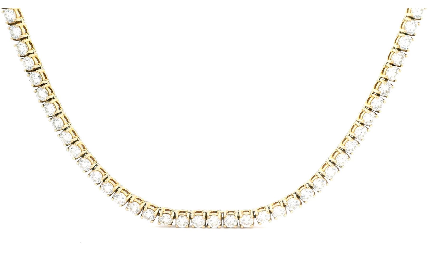This exquisite 14KT yellow gold eternity necklace features a timeless design with a secure tongue clasp and fold-under safety. The piece showcases 158 round brilliant cut diamonds, totaling an impressive 29.50 carats, meticulously prong-set along the entire length of the 27-inch chain. Each diamond is graded H-I in color and VS-1 to SI-1 in clarity, exhibiting exceptional brilliance and fire. The basket motif setting enhances the structural integrity while maintaining a refined and elegant look.
