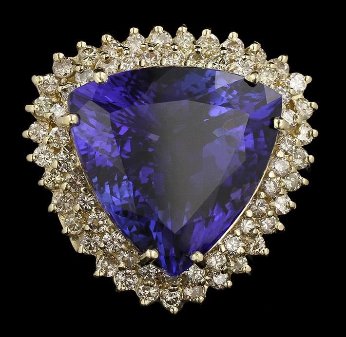 One electronically tested 14KT yellow gold ladies cast tanzanite and diamond ring with a bright polish finish. Condition is new, good workmanship. The featured tanzanite is set within tiered diamond bezels supported by a lattice under gallery, completed by a three and one-half millimeter wide band. Identified with markings of "K14". Containing: One prong set triangular modified brilliant cut natural tanzanite, measuring 19.31 x 19.35 x 12.36mm, exact weight 29.67ct., clarity is eye clean, type I, dark, very slightly grayish, violetish blue color, (GIA vB 7/3), cut is good. Transmitting light with no distortion, transparent. GIA Colored Stone Grading Report attached. Graded loose prior to setting in the GIA Laboratory, Report #6157735278. Tanzanite is a very rare gemstone that is only found in the country of Tanzania. Originally discovered in 1967. Tiffany & Company, named the stone Tanzanite. It is found in the Usumburu Mountains that border the Umba Valley of northern Tanzania. Tanzanite occurs in gray, brown, violet, blue, reddish-purple, & green. The gem is interesting because of its exceptional pleochroism. Rotated in different directions a tanzanite will exhibit multiple changes of color. Tanzanite has a low tolerance to ultrasonic cleaning, and should not be cleaned using this method. Sixty-three prong set round brilliant cut diamonds, measuring 2.20 - 2.00 x 1.26mm (depth est.) approximate total weight of 63 Stones = 2.23ct. Faint brown secondary color throughout. Graded in the setting. Clarity VS-2 to SI-2. Color K - M. Total Weight of Colored Stones 29.67ct. Total Weight of Diamonds 2.23ct. Total Weight of Ring 18.64gm. AIG Appraised at $87,710.00.