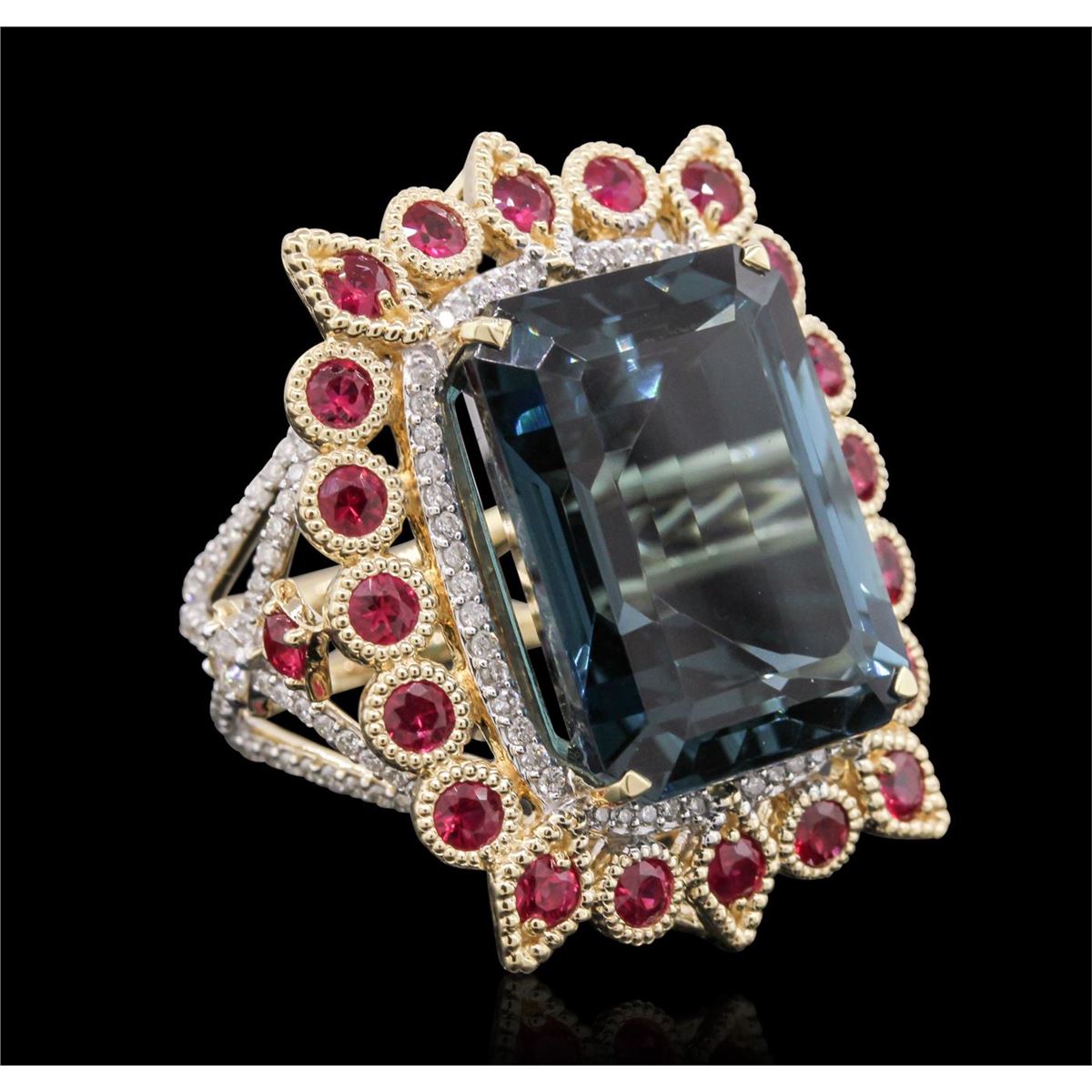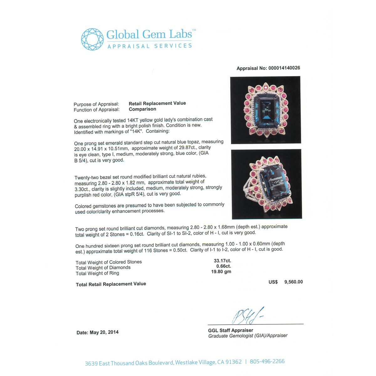 One electronically tested 14KT yellow gold Ladies combination cast & assembled ring with a bright polish finish. Condition is new. Identified with markings of "14K". Containing: One prong set emerald standard step cut natural blue topaz, measuring 20.00 x 14.91 x 10.51mm, approximate weight of 29.87ct., clarity is eye clean, type I, medium, moderately strong, blue color, (GIA B 5/4), cut is very good. Twenty-two bezel set round modified brilliant cut natural rubies, measuring 2.80 - 2.80 x 1.82 mm, approximate. Total Weight of 3.30ct., clarity is slightly included, medium, moderately strong, strongly purplish red color, (GIA stpR 5/4), cut is very good. Colored gemstones are presumed to have been subjected to commonly used color/clarity enhancement processes. Two prong set round brilliant cut diamonds, measuring 2.80 - 2.80 x 1.68mm (depth est.) approximate. Total Weight of 2 Stones = 0.16ct. Clarity: SI-1 to SI-2. Color: H - I, Cut is Very Good. One Hundred Sixteen prong set round brilliant cut diamonds, measuring 1.00 - 1.00 x 0.60mm (depth est.) approximate. Total Weight of 116 Stones = 0.50ct. Clarity: I-1 to I-2. Color: H - I, Cut is Good. Total Weight of Colored Stones 33.17ct. Total Weight of Diamonds 0.66ct. Total Weight of Ring 19.80 grams. GGL Appraised at $9,560.00.