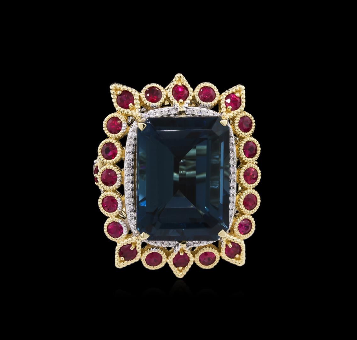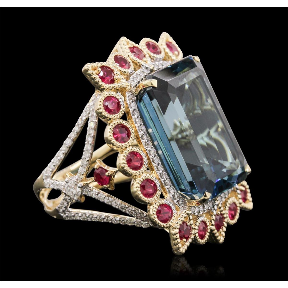 One electronically tested 14KT yellow gold Ladies combination cast & assembled ring with a bright polish finish. Condition is new. Identified with markings of "14K". Containing: One prong set emerald standard step cut natural blue topaz, measuring 20.00 x 14.91 x 10.51mm, approximate weight of 29.87ct., clarity is eye clean, type I, medium, moderately strong, blue color, (GIA B 5/4), cut is very good. Twenty-two bezel set round modified brilliant cut natural rubies, measuring 2.80 - 2.80 x 1.82 mm, approximate. Total Weight of 3.30ct., clarity is slightly included, medium, moderately strong, strongly purplish red color, (GIA stpR 5/4), cut is very good. Colored gemstones are presumed to have been subjected to commonly used color/clarity enhancement processes. Two prong set round brilliant cut diamonds, measuring 2.80 - 2.80 x 1.68mm (depth est.) approximate. Total Weight of 2 Stones = 0.16ct. Clarity: SI-1 to SI-2. Color: H - I, Cut is Very Good. One Hundred Sixteen prong set round brilliant cut diamonds, measuring 1.00 - 1.00 x 0.60mm (depth est.) approximate. Total Weight of 116 Stones = 0.50ct. Clarity: I-1 to I-2. Color: H - I, Cut is Good. Total Weight of Colored Stones 33.17ct. Total Weight of Diamonds 0.66ct. Total Weight of Ring 19.80 grams. GGL Appraised at $9,560.00.