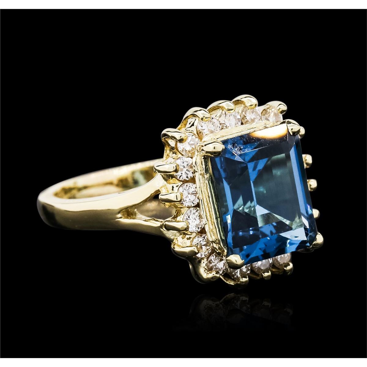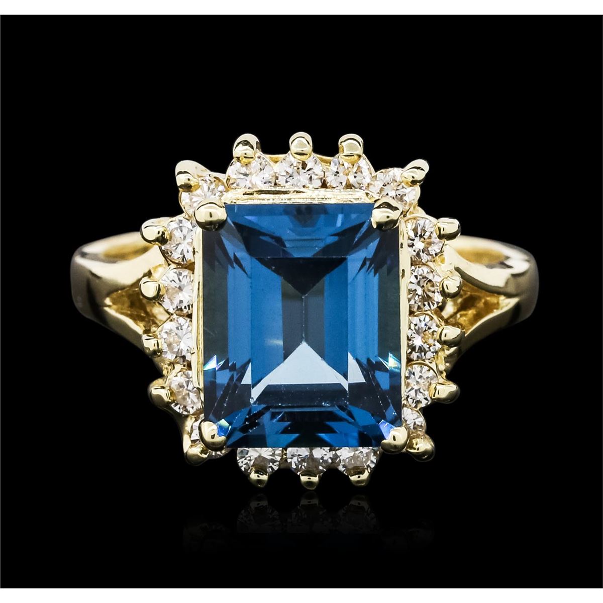 One ring featuring: 14KT yellow gold weighing 6.50 grams containing one blue topaz center stone with a total weight of 3.00ct and round cut diamonds with a total weight of 0.25cts.