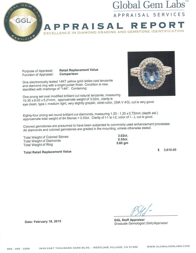 One electronically tested 14KT yellow gold ladies cast tanzanite and diamond ring with a bright polish finish. Identified with markings of "14K". Condition is new. Containing: One prong set oval modified brilliant cut natural tanzanite, measuring 10.30 x 8.00 x 5.21mm, approximate weight of 3.02ct., clarity is eye clean, type I, medium light, very slightly grayish, violet color, (GIA V 4/3), cut is very good. Eighty-Four prong set round brilliant cut diamonds, measuring 1.20 - 1.20 x 0.72mm (depth est.) approximate total weight of 84 Stones = 0.53ct. Clarity: I-1 to I-2. Color: I - J, Cut is Good. Colored gemstones are presumed to have been subjected to commonly used enhancement processes. All diamonds and colored gemstones are graded in the mounting, unless otherwise stated. Total Weight of Colored Stones 3.02ct. Total Weight of Diamonds 0.53ct. Total Weight of Ring 5.80 grams. GGL Appraised.