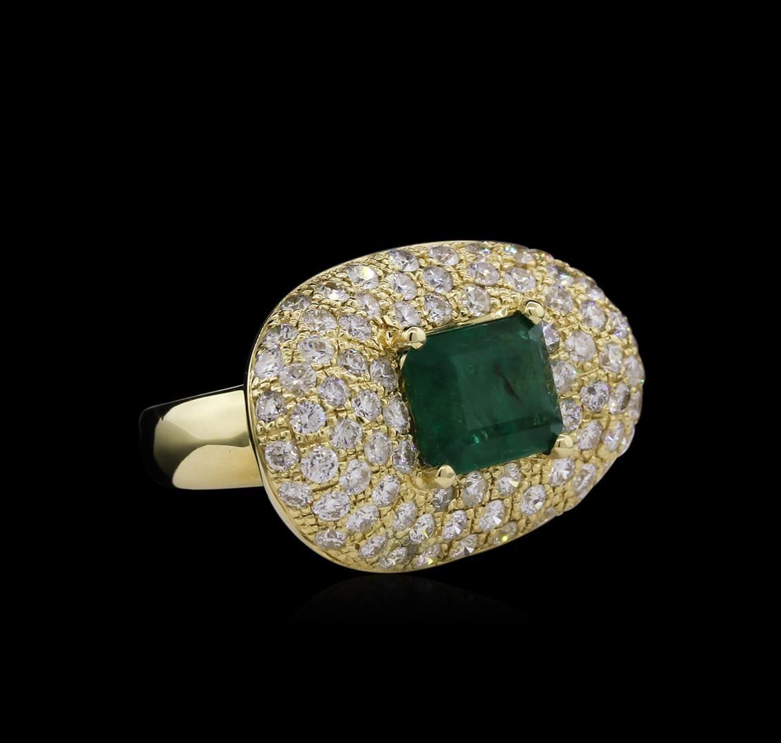 One electronically tested 14KT yellow gold Ladies combination cast & assembled fashion ring with a high polish finish. Condition is new. Identified with markings of "14K". Containing: One prong set emerald standard step cut natural emerald, measuring 10.17 x 8.25 x 5.00mm, approximate weight of 3.08ct., clarity is moderately included, type III, medium dark, moderately strong, green color, (GIA G 6/4), cut is good. Colored gemstones are presumed to have been subjected to commonly used and possible undetectable color/clarity enhancement processes. Eighty prong set round brilliant cut diamonds, measuring 2.10 - 2.00 x 1.23mm (depth est.) approximate total weight of 80 Stones = 2.52ct. Clarity of SI-1 to I-1, Color of H - I, Cut is Good. Total Weight of Colored Stones 3.08ct. Total Weight of Diamonds 2.52ct. Total Weight of Ring 12.10 grams. GGL Appraised.