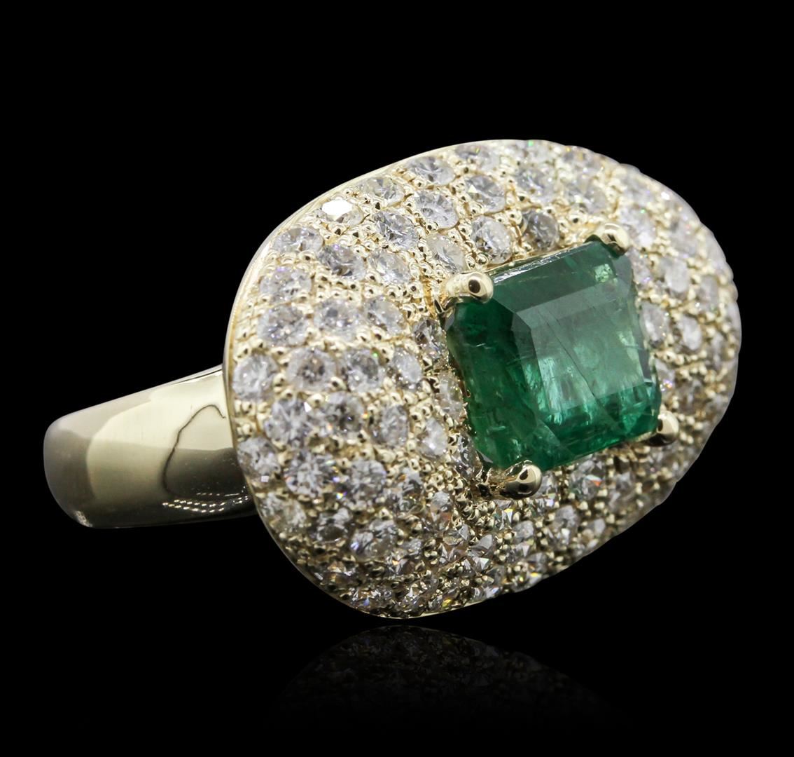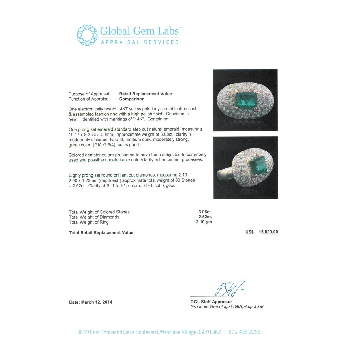 One electronically tested 14KT yellow gold Ladies combination cast & assembled fashion ring with a high polish finish. Condition is new. Identified with markings of "14K". Containing: One prong set emerald standard step cut natural emerald, measuring 10.17 x 8.25 x 5.00mm, approximate weight of 3.08ct., clarity is moderately included, type III, medium dark, moderately strong, green color, (GIA G 6/4), cut is good. Colored gemstones are presumed to have been subjected to commonly used and possible undetectable color/clarity enhancement processes. Eighty prong set round brilliant cut diamonds, measuring 2.10 - 2.00 x 1.23mm (depth est.) approximate total weight of 80 Stones = 2.52ct. Clarity of SI-1 to I-1, Color of H - I, Cut is Good. Total Weight of Colored Stones 3.08ct. Total Weight of Diamonds 2.52ct. Total Weight of Ring 12.10 grams. GGL Appraised at $15,820.00.