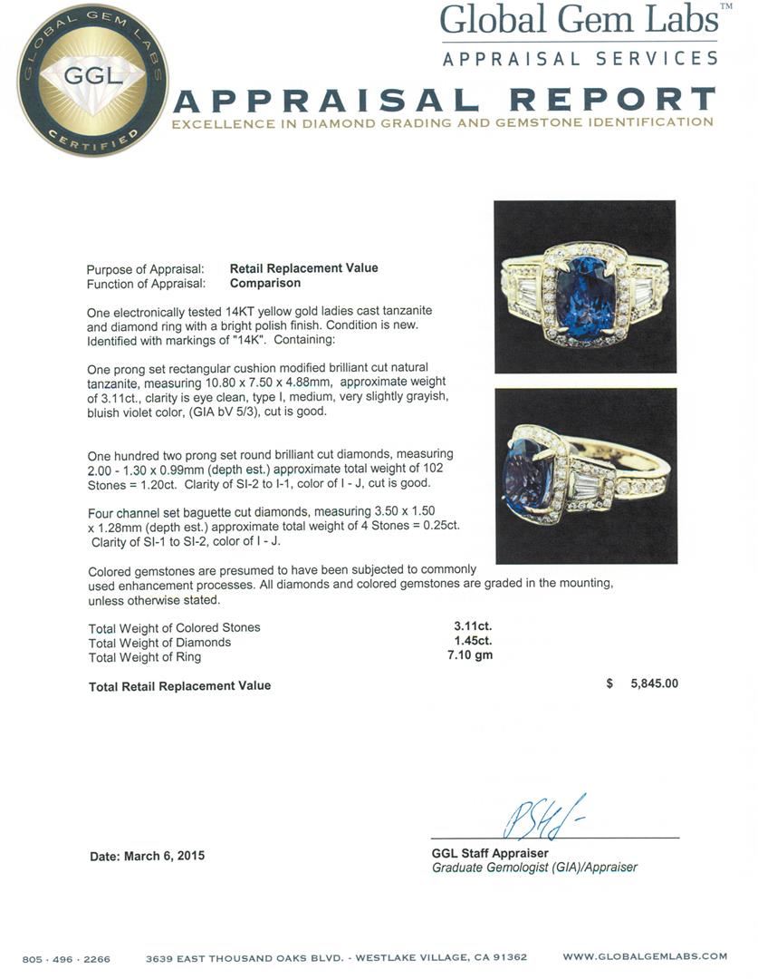 One electronically tested 14KT yellow gold ladies cast tanzanite and diamond ring with a bright polish finish. Identified with markings of "14K". Condition is new. Containing: One prong set rectangular cushion modified brilliant cut natural tanzanite, measuring 10.80 x 7.50 x 4.88mm, approximate weight of 3.11ct., clarity is eye clean, type I, medium, very slightly grayish, bluish violet color, (GIA bV 5/3), cut is good. One Hundred Two prong set round brilliant cut diamonds, measuring 2.00 - 1.30 x 0.99mm (depth est.) approximate total weight of 102 Stones = 1.20 ct. . Clarity: SI-2 to I-1. Color: I - J, Cut is Good. Four channel set baguette cut diamonds, measuring 3.50 x 1.50 x 1.28mm (depth est.) approximate total weight of 4 Stones = 0.25ct. . Clarity: SI-1 to SI-2. Color: I - J. Colored gemstones are presumed to have been subjected to commonly used enhancement processes. All diamonds and colored gemstones are graded in the mounting, unless otherwise stated.. Total Weight of Colored Stones 3.11ct.. Total Weight of Diamonds 1.45ct.. Total Weight of Ring 7.10 grams. GGL Appraised.