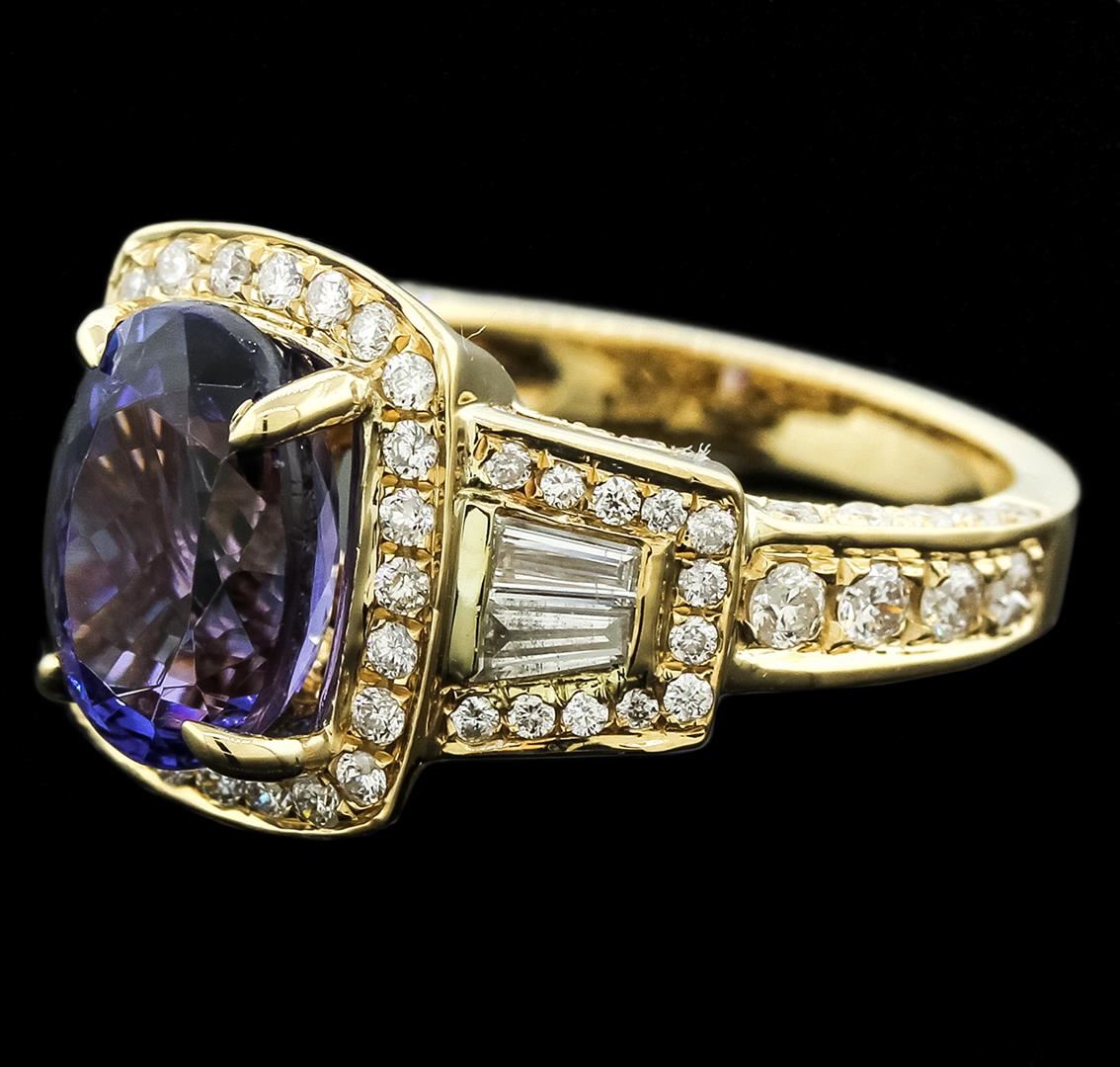 One electronically tested 14KT yellow gold ladies cast tanzanite and diamond ring with a bright polish finish. Identified with markings of "14K". Condition is new. Containing: One prong set rectangular cushion modified brilliant cut natural tanzanite, measuring 10.80 x 7.50 x 4.88mm, approximate weight of 3.11ct., clarity is eye clean, type I, medium, very slightly grayish, bluish violet color, (GIA bV 5/3), cut is good. One Hundred Two prong set round brilliant cut diamonds, measuring 2.00 - 1.30 x 0.99mm (depth est.) approximate total weight of 102 Stones = 1.20 ct. . Clarity: SI-2 to I-1. Color: I - J, Cut is Good. Four channel set baguette cut diamonds, measuring 3.50 x 1.50 x 1.28mm (depth est.) approximate total weight of 4 Stones = 0.25ct. . Clarity: SI-1 to SI-2. Color: I - J. Colored gemstones are presumed to have been subjected to commonly used enhancement processes. All diamonds and colored gemstones are graded in the mounting, unless otherwise stated.. Total Weight of Colored Stones 3.11ct.. Total Weight of Diamonds 1.45ct.. Total Weight of Ring 7.10 grams. GGL Appraised.