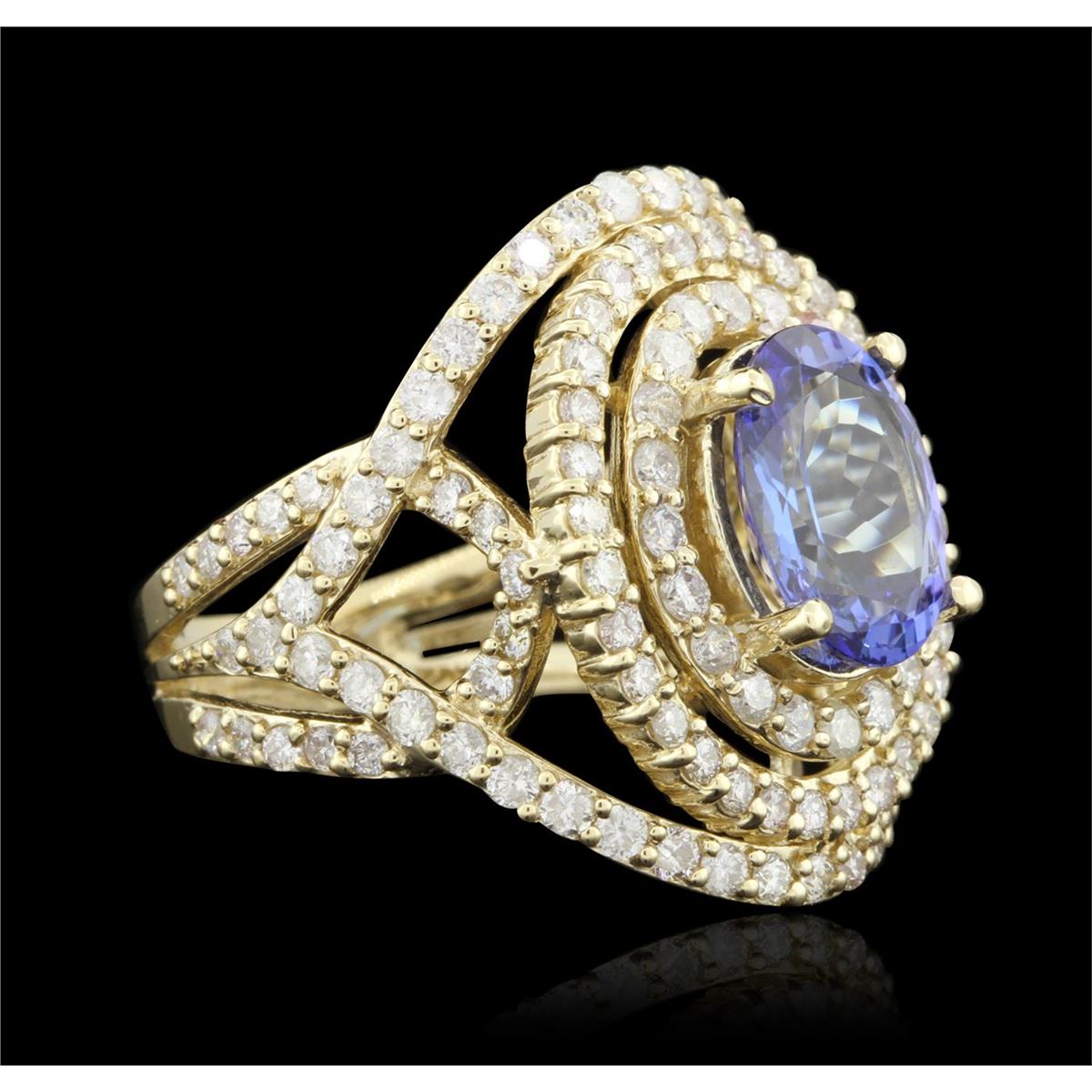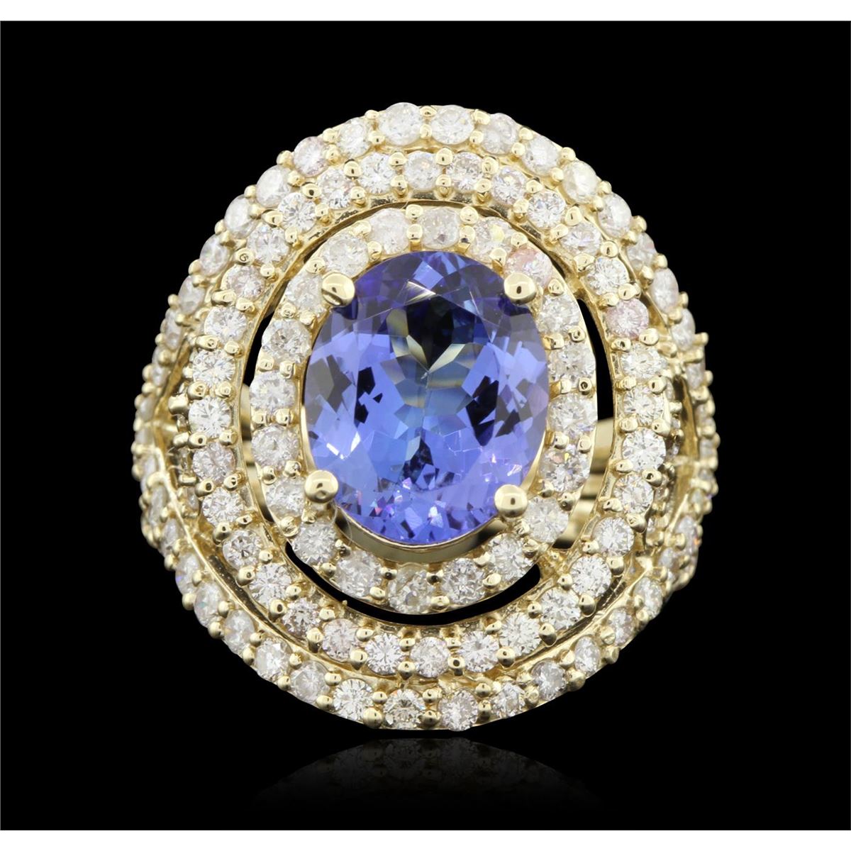 One electronically tested 14KT yellow gold ladies cast tanzanite and diamond ring with a bright polish finish. Condition is good. The featured tanzanite is set within tiered diamond bezels supported by elaborate diamond set split shoulders, completed by a four millimeter wide band. Identified with markings of "K14". Containing: One prong set oval mixed cut natural tanzanite, measuring 11.00 x 9.00 x 4.60mm, approximate weight of 3.15ct., clarity is eye clean, type I, medium dark, very slightly grayish, bluish violet color, (GIA bV 6/3), cut is good. Transmitting light with no distortion, transparent. Graded in the setting. Tanzanite is a very rare gemstone that is only found in the country of Tanzania. Originally discovered in 1967. Tiffany & Company, named the stone Tanzanite. It is found in the Usumburu Mountains that border the Umba Valley of northern Tanzania. Tanzanite occurs in gray, brown, violet, blue, reddish-purple, & green. The gem is interesting because of its exceptional pleochroism. Rotated in different directions a tanzanite will exhibit multiple changes of color. Tanzanite has a low tolerance to ultrasonic cleaning, and should not be cleaned using this method. One hundred twenty-eight prong set round brilliant cut diamonds, measuring 1.80 - 1.50 x 0.99mm (depth est.) approximate total weight of 128 Stones = 2.54ct. Graded in the setting. Clarity I-I to I-2. Color G - I. Total Weight of Colored Stones 3.15ct. Total Weight of Diamonds 2.54ct. Total Weight of Ring 10.90gm. AIG Appraised at $15,870.00.