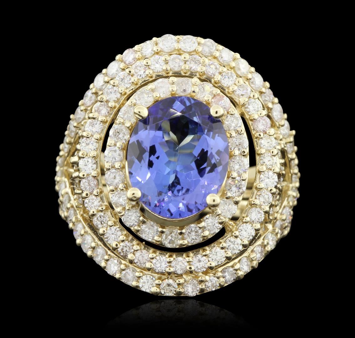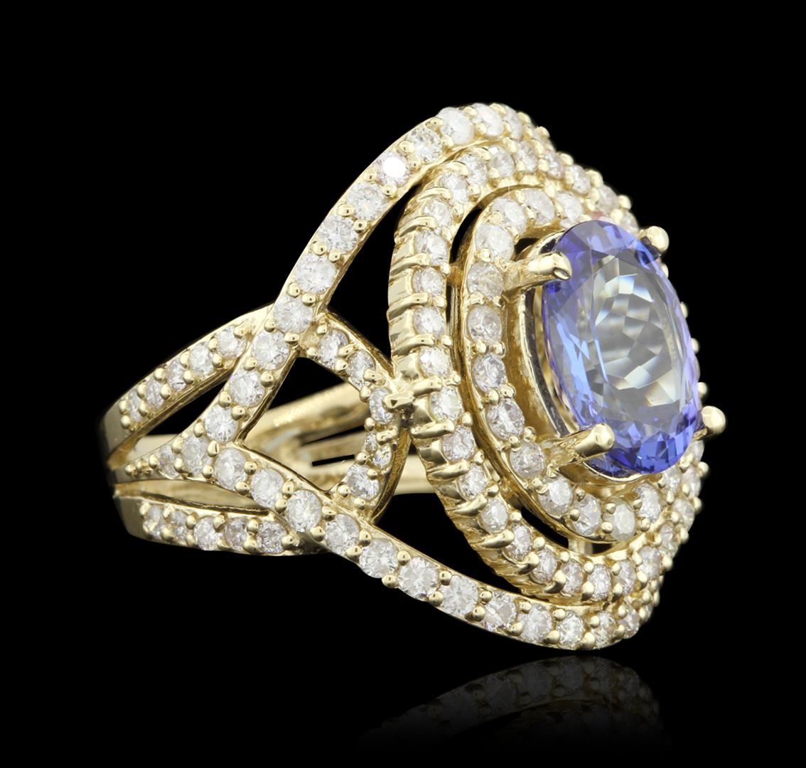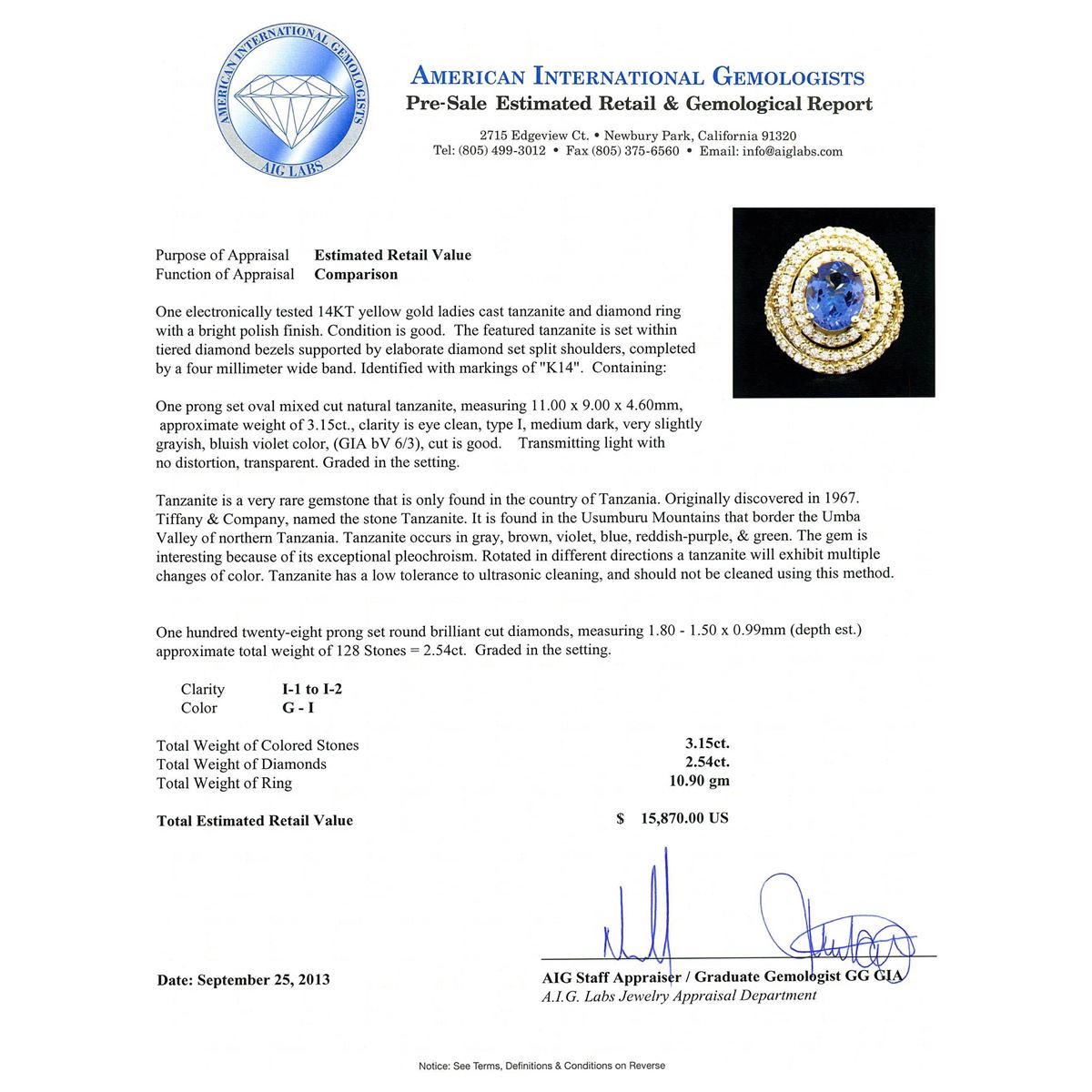 One electronically tested 14KT yellow gold ladies cast tanzanite and diamond ring with a bright polish finish. Condition is good. The featured tanzanite is set within tiered diamond bezels supported by elaborate diamond set split shoulders, completed by a four millimeter wide band. Identified with markings of "K14". Containing: One prong set oval mixed cut natural tanzanite, measuring 11.00 x 9.00 x 4.60mm, approximate weight of 3.15ct., clarity is eye clean, type I, medium dark, very slightly grayish, bluish violet color, (GIA bV 6/3), cut is good. Transmitting light with no distortion, transparent. Graded in the setting. Tanzanite is a very rare gemstone that is only found in the country of Tanzania. Originally discovered in 1967. Tiffany & Company, named the stone Tanzanite. It is found in the Usumburu Mountains that border the Umba Valley of northern Tanzania. Tanzanite occurs in gray, brown, violet, blue, reddish-purple, & green. The gem is interesting because of its exceptional pleochroism. Rotated in different directions a tanzanite will exhibit multiple changes of color. Tanzanite has a low tolerance to ultrasonic cleaning, and should not be cleaned using this method. One hundred twenty-eight prong set round brilliant cut diamonds, measuring 1.80 - 1.50 x 0.99mm (depth est.) approximate total weight of 128 Stones = 2.54ct. Graded in the setting. Clarity I-I to I-2. Color G -- I. Total Weight of Colored Stones 3.15ct. Total Weight of Diamonds 2.54ct. Total Weight of Ring 10.90gm. AIG Appraised at $15,870.00.