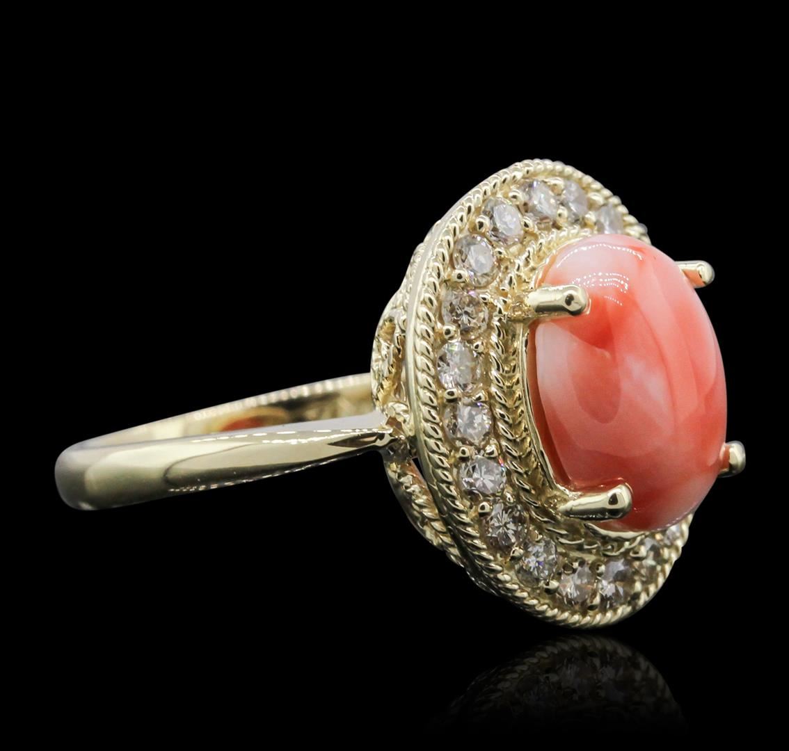 One electronically tested 14KT yellow gold ladies cast coral and diamond ring with a bright and milgrain finish. Condition is new, good workmanship. The featured coral is set within a diamond lattice gallery, completed by a two millimeter wide band. Identified with markings of "K14". Containing: One prong set oval cabochon cut natural salmon coral, measuring 10.90 x 9.00 x 4.50mm, approximate weight of 3.16ct., clarity is severely included, medium light, moderately strong, reddish orange color, (GIA rO 4/4), cut is good. Transmitting light very diffusely, opaque. Naturally occurring internal & external characteristics are present. Graded in the setting. Coral (Corallium Japonicum) is formed undersea by microscopic animals called coral polyps. These tiny, creatures form minute, hard shells. As a colony grows, it takes on complex branching, tree-like forms which allows the maximum number of polyps to be fed by the nutrients in the water. It grows about one quarter inch per year. This color of coral is commonly treated to improve or change the color and stability. Evidence that may confirm this is typically lacking. Twenty bead set round brilliant cut diamonds, measuring 2.00 - 1.90 x 1.17mm (depth est.) approximate. Total Weight of 20 Stones = 0.64ct. Graded in the setting. Clarity: SI-1 to I-1. Color: G - I. Total Weight of Colored Stones 3.16ct. Total Weight of Diamonds 0.64ct. Total Weight of Ring 5.80 grams. AIG Appraised at $3,865.00.