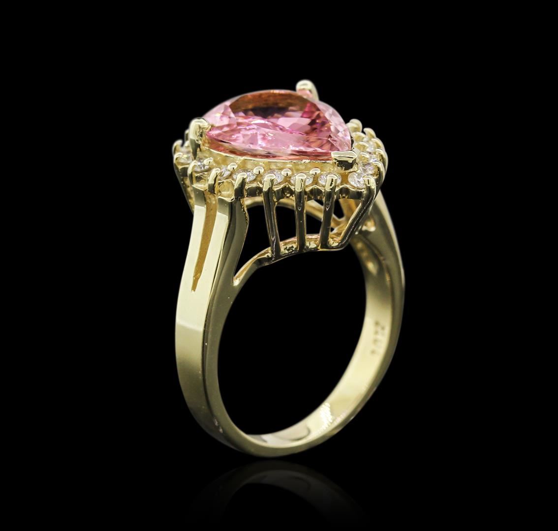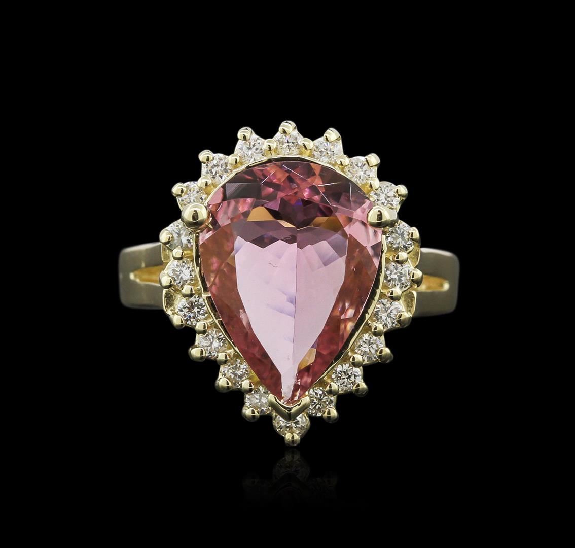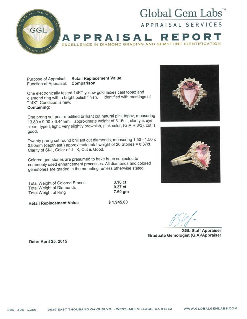 One electronically tested 14KT yellow gold ladies cast topaz and diamond ring with a bright polish finish. Identified with markings of "14K". Condition is new. Containing: One prong set pear modified brilliant cut natural pink topaz, measuring 13.80 x 9.90 x 6.44mm, approximate weight of 3.16ct., clarity is eye clean, type I, light, very slightly brownish, pink color, (GIA R 3/3), cut is good. Twenty prong set round brilliant cut diamonds, measuring 1.50 - 1.50 x 0.90mm (depth est.) approximate total weight of 20 Stones = 0.37ct. Clarity: SI-1. Color: J - K, Cut is Good. Colored gemstones are presumed to have been subjected to commonly used enhancement processes. All diamonds and colored gemstones are graded in the mounting, unless otherwise stated. Total Weight of Colored Stones 3.16ct. Total Weight of Diamonds 0.37ct. Total Weight of Ring 7.60 grams. GGL Appraised at $1,945.00.