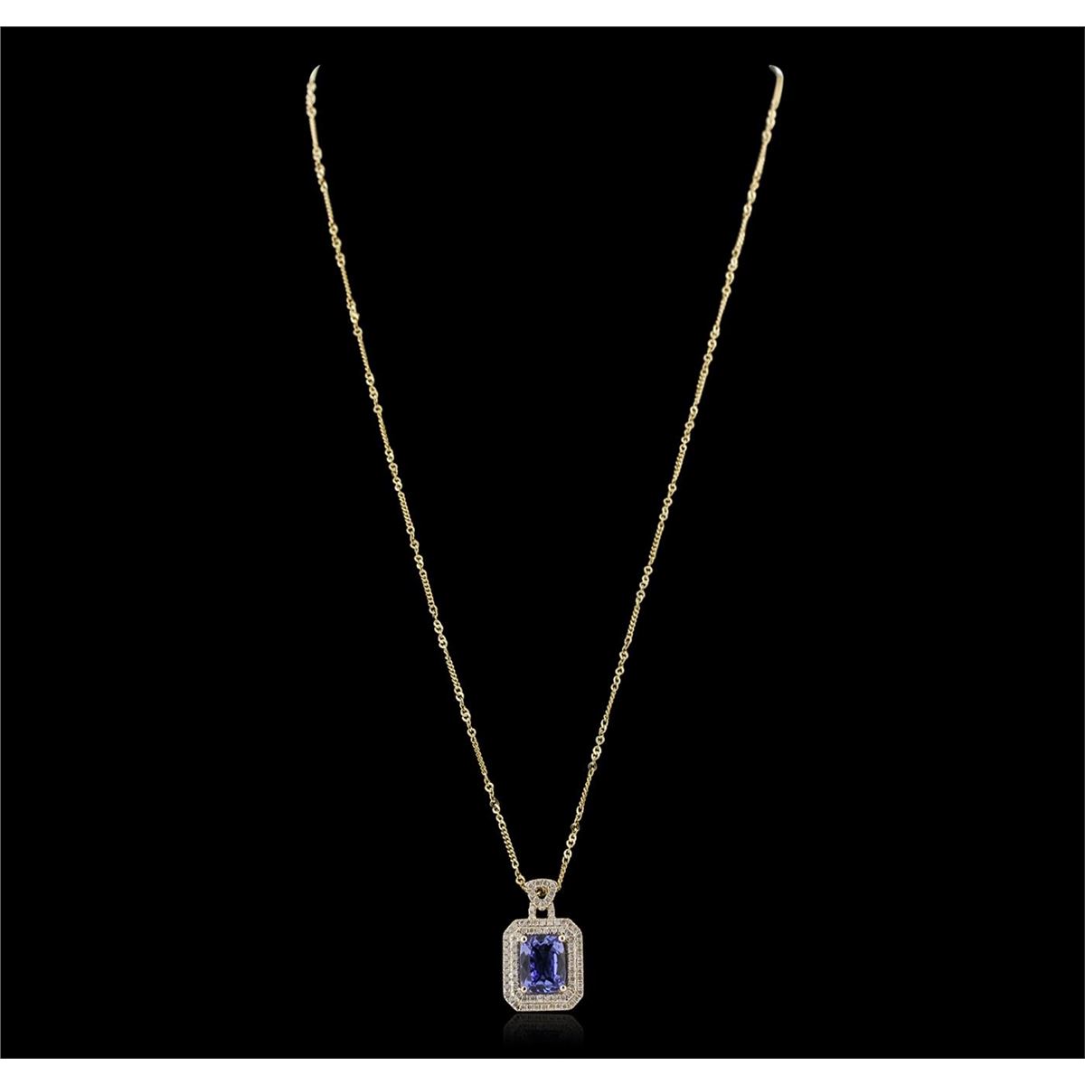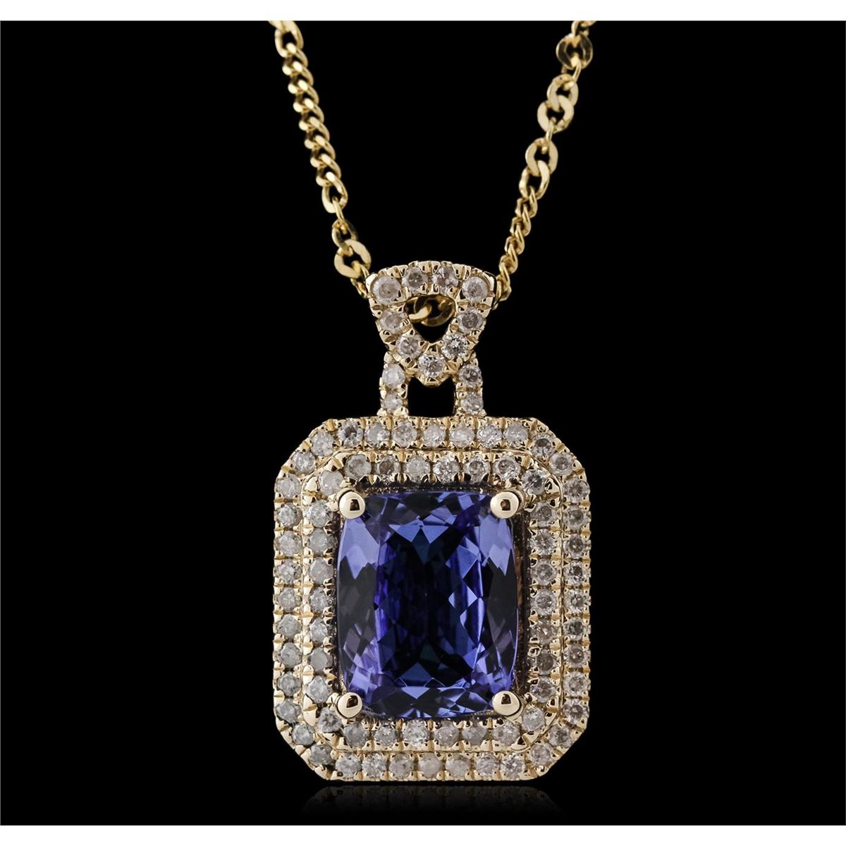 One electronically tested 14KT yellow gold ladies cast & assembled tanzanite and diamond pendant with chain. The pendant features a tanzanite set within two tiered diamond bezels, completed by a diamond set bail. The pendant is supported by an eighteen inch length 14KT yellow gold designer style chain, terminating in a spring ring clasp. Bright polish finish. Trademark is Orianne. Identified with markings of "14K". Condition is new, good workmanship. Containing: One prong set rectangular cushion brilliant cut natural tanzanite, measuring 10.10 x 8.00 x 4.70mm, 6% bulge factor, approximate weight of 3.17ct., clarity is eye clean, type I, medium dark, very slightly grayish, violetish blue color, (GIA vB 6/3), cut is good. Transmitting light with no distortion, transparent. Graded in the setting. Tanzanite is a very rare gemstone that is only found in the country of Tanzania. Originally discovered in 1967. Tiffany & Company, named the stone Tanzanite. It is found in the Usumburu Mountains that border the Umba Valley of northern Tanzania. Tanzanite occurs in gray, brown, violet, blue, reddish-purple, & green. The gem is interesting because of its exceptional pleochroism. Rotated in different directions a tanzanite will exhibit multiple changes of color. Tanzanite has a low tolerance to ultrasonic cleaning, and should not be cleaned using this method. Eighty-Three prong set round brilliant cut diamonds, measuring 1.20 - 1.10 x 0.69mm (depth est.) approximate total weight of 83 Stones = 0.55ct. Graded in the setting. Clarity: I-1 to I-2. Color: G - I. Total Weight of Colored Stones 3.17ct. Total Weight of Diamonds 0.55ct. Total Weight of Pendant With Chain 5.44 grams. AIG Appraised at $10,505.00.
