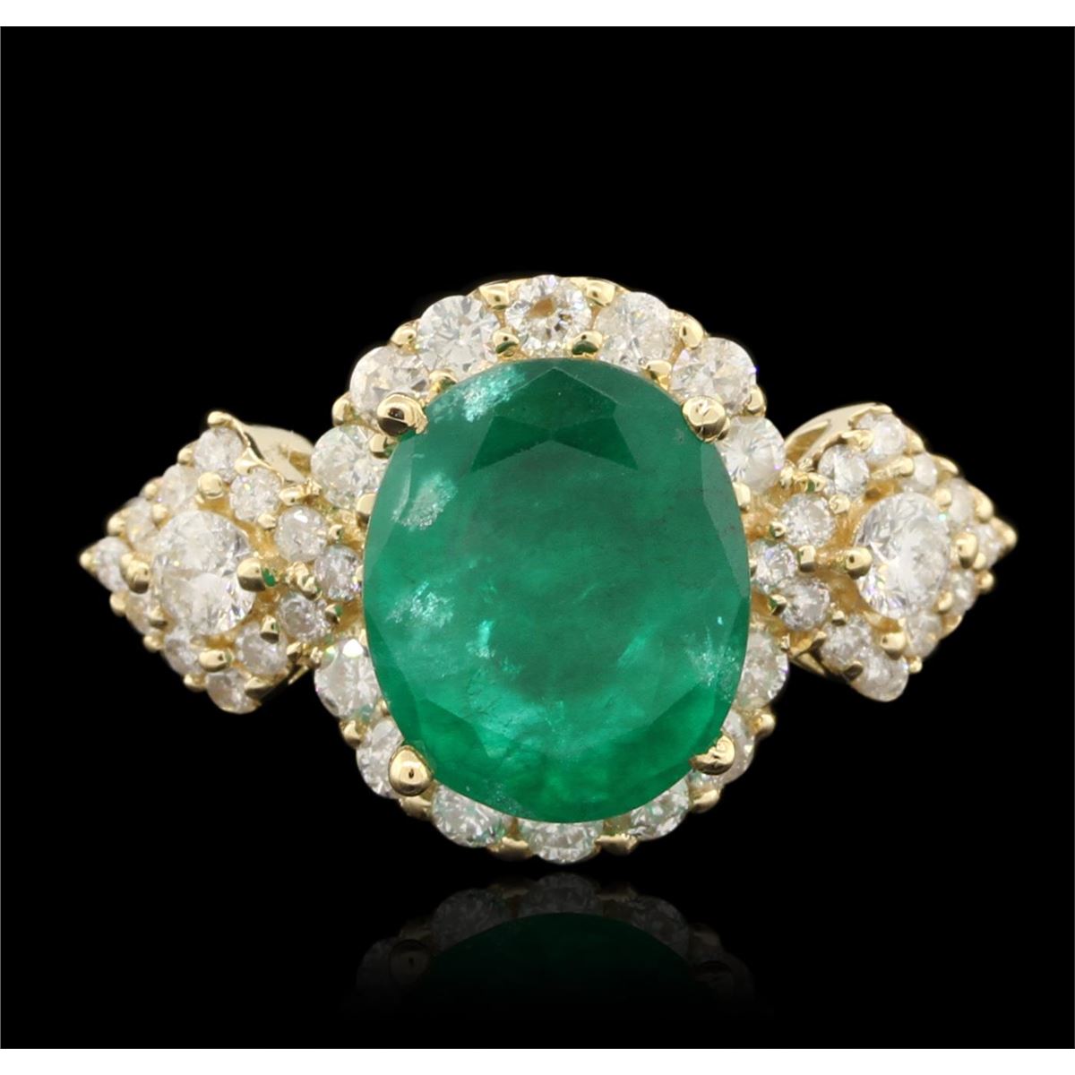 One electronically tested 14KT yellow gold Ladies combination cast & assembled cocktail ring with a bright polish finish. Trademark is Orianne. Identified with markings of "14K". Condition is excellent. Containing: One prong set oval modified brilliant cut natural emerald, measuring 11.00 x 9.00 x 5.20mm, approximate weight of 3.22ct., clarity is heavily included, type III, medium, moderately strong, green color, (GIA G 5/4), cut is very good. Colored gemstones are presumed to have been subjected to commonly used and possible undetectable color/clarity enhancement processes. Two prong set round brilliant cut diamonds, measuring 3.00 - 3.00 x 1.80mm (depth est.) approximate total weight of 2 Stones = 0.20ct. Clarity of SI-2, Color of G - H, Cut is Very Good. Thirty-Eight prong set round brilliant cut diamonds, measuring 2.00 - 1.00 x 0.90mm (depth est.) approximate total weight of 38 Stones = 0.73ct. Clarity of SI-2 to I-1, Color of I - J, Cut is Good. Total Weight of Colored Stones 3.22ct. Total Weight of Diamonds 0.93ct. Total Weight of Ring4.70gm. GGL Appraised at $8,220.00.