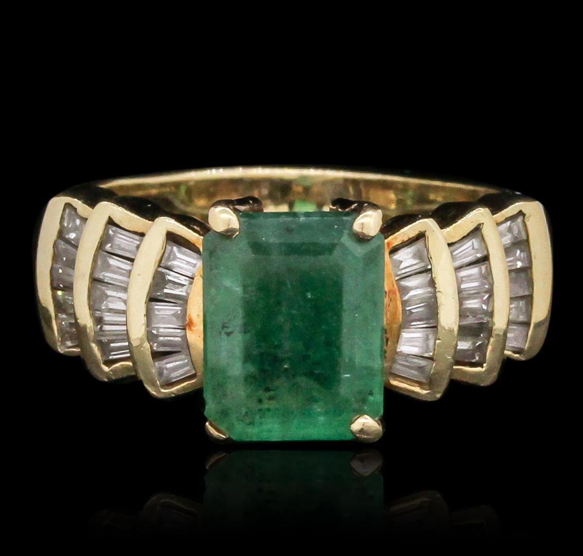 One electronically tested 14KT yellow gold Ladies combination cast & assembled ring with a bright polish finish. Identified with markings of "14K". Condition is new. Containing: One prong set emerald standard step cut natural emerald, measuring 10.09 x 8.05 x 5.47mm, approximate weight of 3.26ct., clarity is heavily included, type III, medium dark, moderately strong, green color, (GIA G 6/4), cut is good. Colored gemstones are presumed to have been subjected to commonly used color/clarity enhancement processes. Thirty prong set baguette cut diamonds, measuring 2.20 x 1.30 x 1.11mm (depth est.) approximate. Total Weight of 30 Stones = 0.87ct. Clarity: I-2 to I-3. Color: I - J, Cut is Fair. Total Weight of Colored Stones 3.26ct. Total Weight of Diamonds 0.87ct. Total Weight of Ring 8.40 grams. GGL Appraised at $9,900.00.