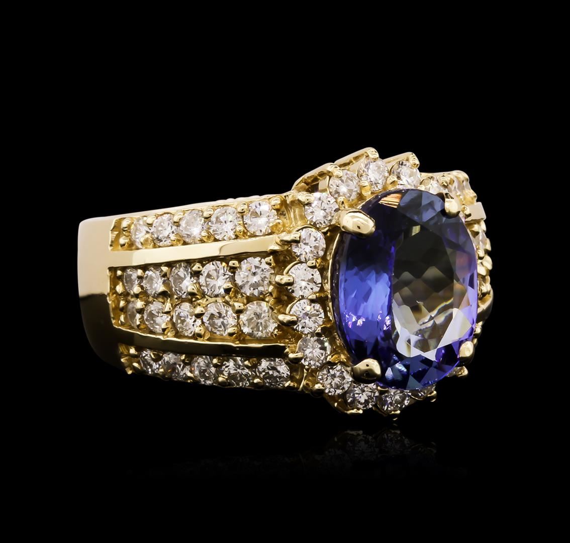 One electronically tested 14KT yellow gold ladies cast tanzanite and diamond ring with a bright polish finish. Identified with markings of "K14". Condition is new. Containing: One prong set oval modified brilliant cut natural tanzanite, measuring 10.70 x 8.20 x 5.33mm, approximate weight of 3.29ct., clarity is eye clean, type I, medium light, very slightly grayish, violet color, (GIA V 4/3), cut is good. Fifty-Eight prong set round brilliant cut diamonds, measuring 1.80 - 1.80 x 1.08mm (depth est.) approximate total weight of 58 Stones = 1.24ct. Clarity: SI-1 to I-1. Color: H - I, Cut is Good. Colored gemstones are presumed to have been subjected to commonly used enhancement processes. All diamonds and colored gemstones are graded in the mounting, unless otherwise stated. Total Weight of Colored Stones 3.29ct. Total Weight of Diamonds 1.24ct. Total Weight of Ring 11.30 grams. GGL Appraised at $6,870.00.