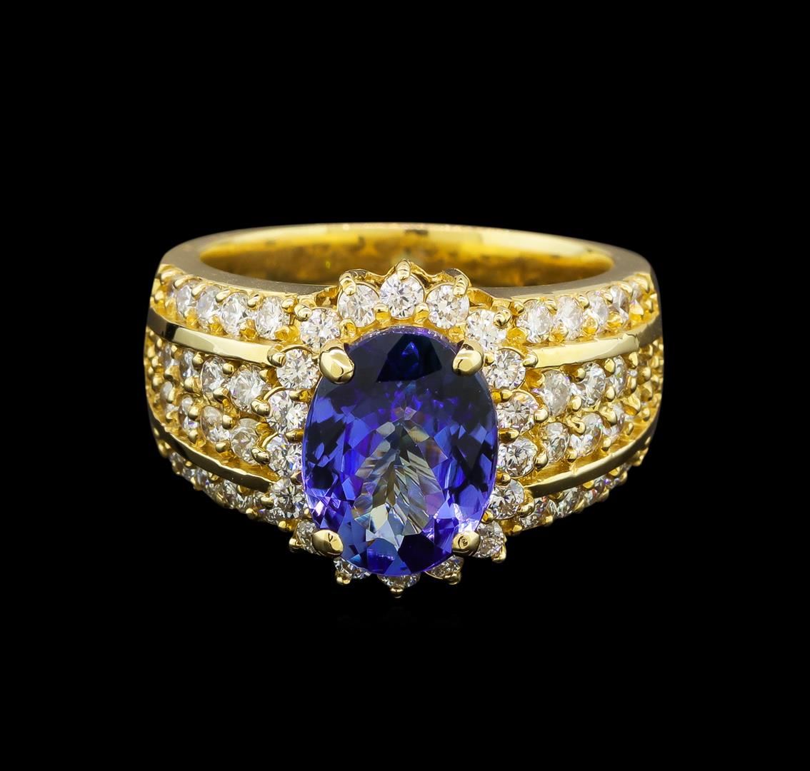 One electronically tested 14KT yellow gold ladies cast tanzanite and diamond ring with a bright polish finish. Identified with markings of "K14". Condition is new. Containing: One prong set oval modified brilliant cut natural tanzanite, measuring 10.70 x 8.20 x 5.33mm, approximate weight of 3.29ct., clarity is eye clean, type I, medium light, very slightly grayish, violet color, (GIA V 4/3), cut is good. Fifty-Eight prong set round brilliant cut diamonds, measuring 1.80 - 1.80 x 1.08mm (depth est.) approximate total weight of 58 Stones = 1.24ct. Clarity: SI-1 to I-1. Color: H - I, Cut is Good. Colored gemstones are presumed to have been subjected to commonly used enhancement processes. All diamonds and colored gemstones are graded in the mounting, unless otherwise stated. Total Weight of Colored Stones 3.29ct. Total Weight of Diamonds 1.24ct. Total Weight of Ring 11.30 grams. GGL Appraised at $6,870.00.