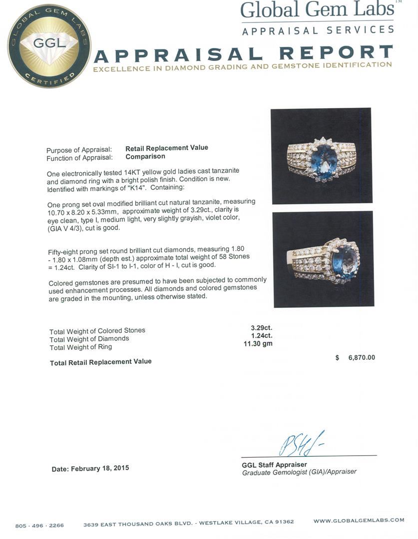 One electronically tested 14KT yellow gold ladies cast tanzanite and diamond ring with a bright polish finish. Identified with markings of "K14". Condition is new. Containing: One prong set oval modified brilliant cut natural tanzanite, measuring 10.70 x 8.20 x 5.33mm, approximate weight of 3.29ct., clarity is eye clean, type I, medium light, very slightly grayish, violet color, (GIA V 4/3), cut is good. Fifty-Eight prong set round brilliant cut diamonds, measuring 1.80 - 1.80 x 1.08mm (depth est.) approximate total weight of 58 Stones = 1.24ct. Clarity: SI-1 to I-1. Color: H - I, Cut is Good. Colored gemstones are presumed to have been subjected to commonly used enhancement processes. All diamonds and colored gemstones are graded in the mounting, unless otherwise stated. Total Weight of Colored Stones 3.29ct. Total Weight of Diamonds 1.24ct. Total Weight of Ring 11.30 grams. GGL Appraised at $6,870.00.