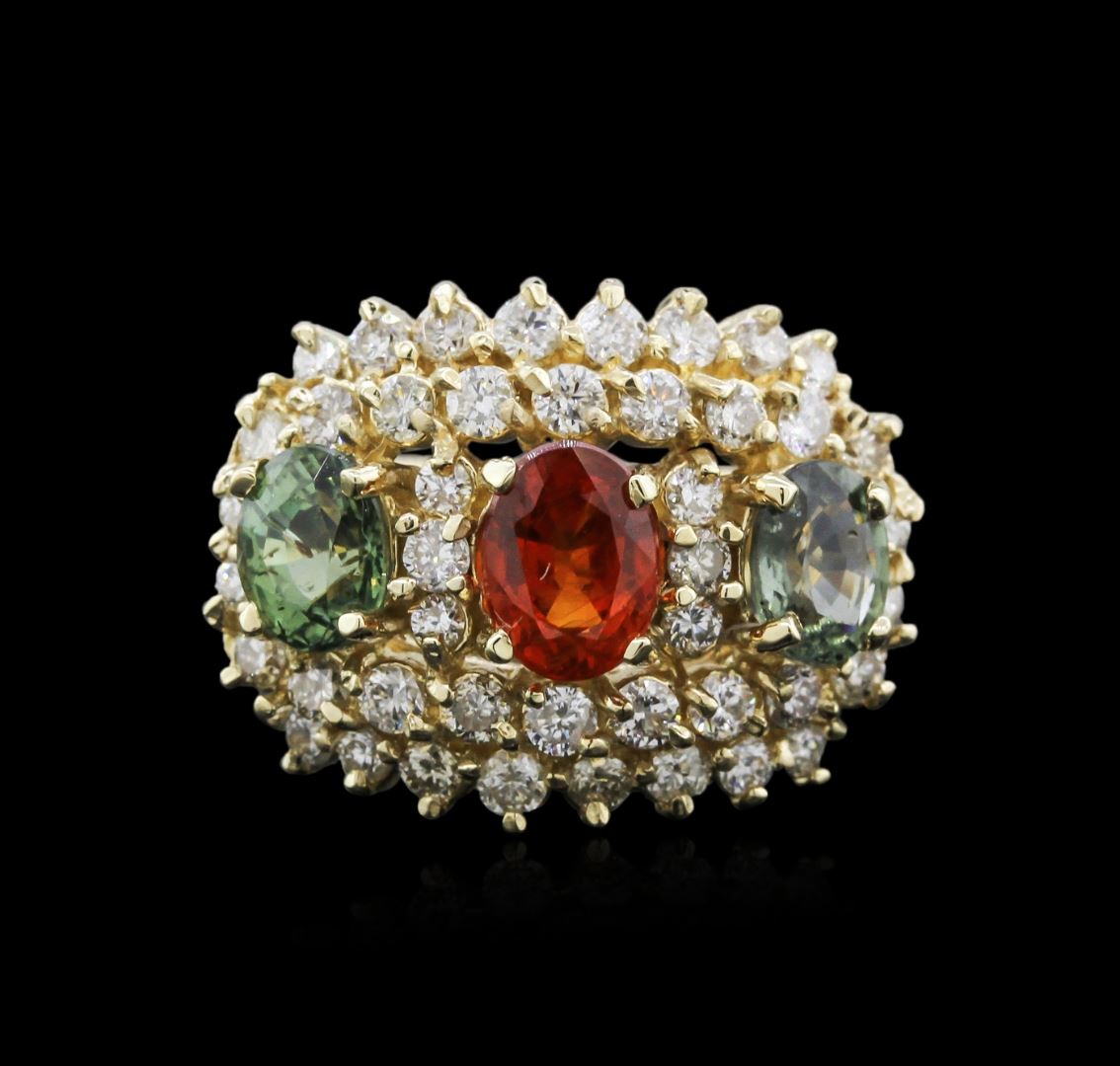 One electronically tested 14KT yellow gold ladies cast sapphire and diamond ring with a bright polish finish. Identified with markings of "14K". Condition is new. Containing: One prong set oval modified brilliant cut natural orange sapphire, measuring 7.00. x 5.20 x 3.38mm, approximate weight of 1.10ct., clarity is moderately included, type II, medium, brownish, orange color, (GIA O 5/3), cut is good. Two prong set oval modified brilliant cut natural green sapphires, measuring 7.00. x 5.30 x 3.45mm, approximate total weight of 2.22ct., clarity is moderately included, medium light, very slightly grayish, green color, (GIA G 4/3), cut is good. Forty-Four prong set round brilliant cut diamonds, measuring 2.00. - 1.50 x 1.05mm (depth est.) approximate total weight of 44 Stones = 1.27ct. Clarity: SI-1 to I-1. Color: J - K, Cut is Good. Colored gemstones are presumed to have been subjected to commonly used enhancement processes. All diamonds and colored gemstones are graded in the mounting, unless otherwise stated. Total Weight of Colored Stones 3.32ct. Total Weight of Diamonds 1.27ct. Total Weight of Ring 9.30 grams. GGL Appraised at $4,125.00.