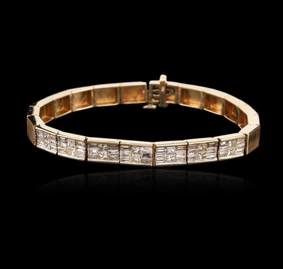One electronically tested 14KT yellow gold ladies cast & assembled diamond bracelet with a bright and satin finish. Seven inch length bracelet features seven invisible set diamond links transitioning into yellow gold links, terminating in a concealed clasp with safety bar. Identified with markings of "14K". Condition is good. Containing: Fourteen invisible set princess cut diamonds, measuring 2.60 x 2.50 x 1.88mm (depth est.) approximate total weight of 14 Stones = 1.45ct. Graded in the setting. Clarity: SI-2 to I-2. Color: H - J Forty-Two invisible set baguette cut diamonds, measuring from 2.90 x 1.50 x 1.05mm (depth est.) to 3.00 x 1.60 x 1.12mm (depth est.) approximate total weight of 42 Stones = 1.90ct. Graded in the setting. Clarity: SI-2 to I-2. Color: H - J. Total Weight of Diamonds 3.35ct. Total Weight of Bracelet 23.29 grams. AIG Appraised at $10,140.00.