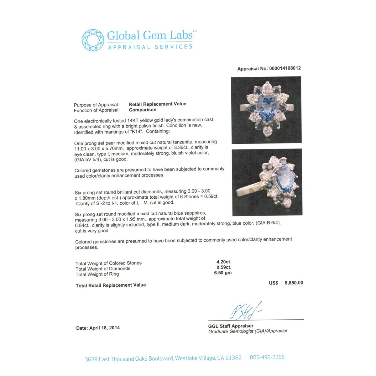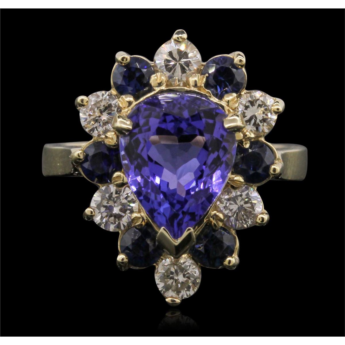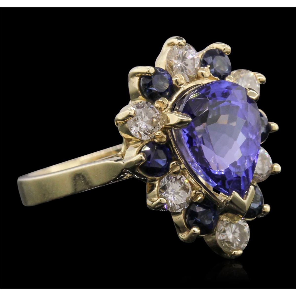 One electronically tested 14KT yellow gold Ladies combination cast & assembled ring with a bright polish finish. Identified with markings of "K14". Condition is new. Containing: One prong set pear modified mixed cut natural tanzanite, measuring 11.00 x 8.00 x 5.70mm, approximate weight of 3.36ct., clarity is eye clean, type I, medium, moderately strong, bluish violet color, (GIA bV 5/4), cut is good. Colored gemstones are presumed to have been subjected to commonly used color/clarity enhancement processes. Six prong set round brilliant cut diamonds, measuring 3.00 - 3.00 x 1.80mm (depth est.) approximate. Total Weight of 6 Stones = 0.59ct. Clarity: SI-2 to I-1. Color: L - M, Cut is Good. Six prong set round modified mixed cut natural blue sapphires, measuring 3.00 - 3.00 x 1.95 mm, approximate. Total Weight of 0.84ct., clarity is slightly included, type II, medium dark, moderately strong, blue color, (GIA B 6/4), cut is very good. Colored gemstones are presumed to have been subjected to commonly used color/clarity enhancement processes. Total Weight of Colored Stones 4.20ct. Total Weight of Diamonds 0.59ct. Total Weight of Ring 6.50 grams. GGL Appraised at $8,850.00.