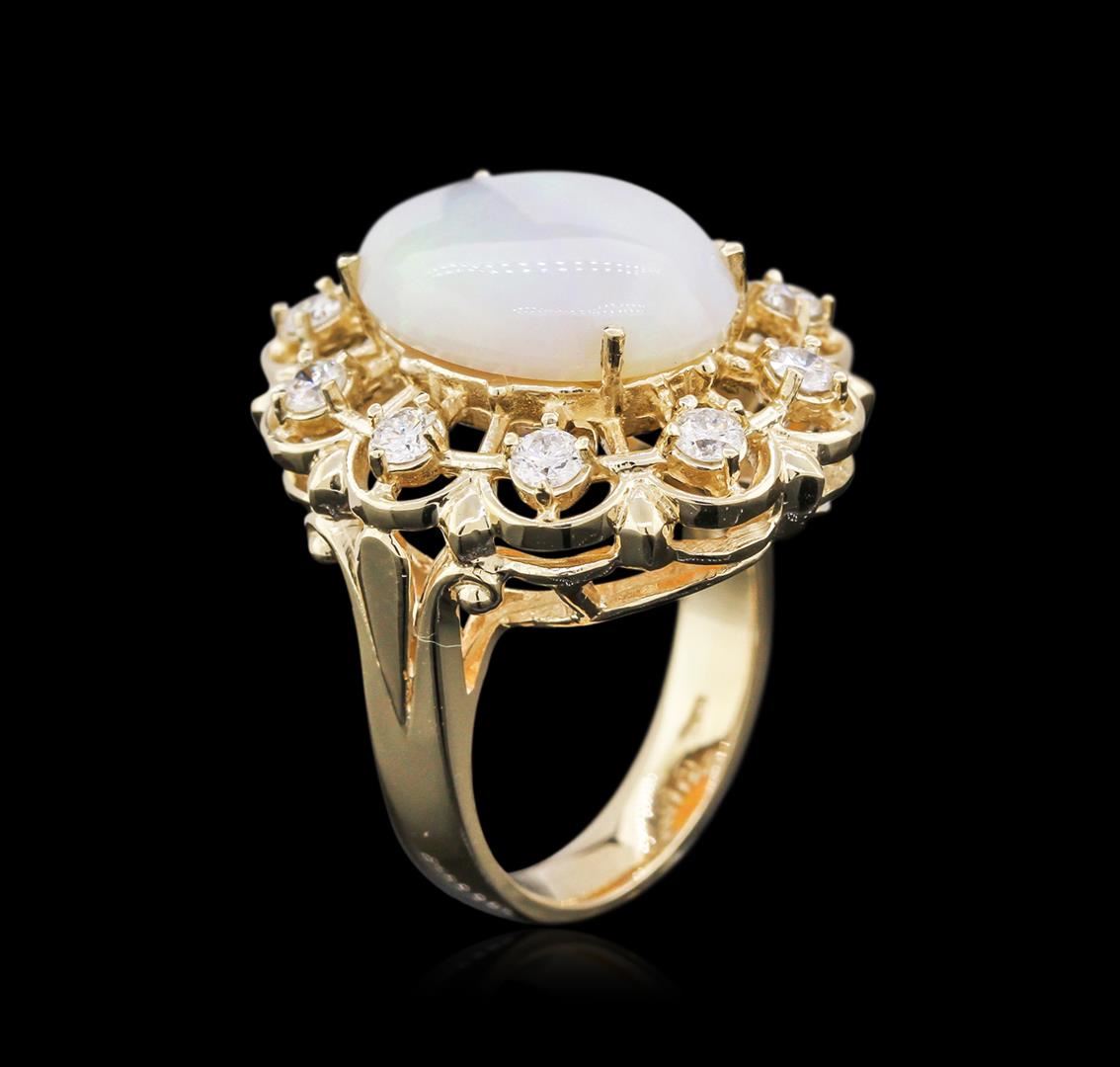 One electronically tested 14KT yellow gold ladies cast opal and diamond ring with a bright polish finish. Identified with markings of "14K". Condition is new. Containing: One white opal that is cut in a oval shape and is prong set, measuring 16.00. mm long x 12.00. mm wide, and 4.00. mm thick and the approximate weight is 3.37 carats. The opal has a somewhat bright, green-orange play of color (fire) in a flashfire pattern; a dome; a good cut; no inclusions; consistent in its brightness and pattern; and is somewhat directional. Ten prong set round brilliant cut diamonds, measuring 3.00. - 3.00. x 1.80mm (depth est.) approximate total weight of 10 Stones = 0.99ct. Clarity: SI-1 to I-1. Color: I - J, Cut is Good. Colored gemstones are presumed to have been subjected to commonly used enhancement processes. All diamonds and colored gemstones are graded in the mounting, unless otherwise stated. Total Weight of Diamonds 0.99ct. Total Weight of Opals 3.37ct. Total Weight of Ring 10.80 grams. GGL Appraised at $4,190.00.